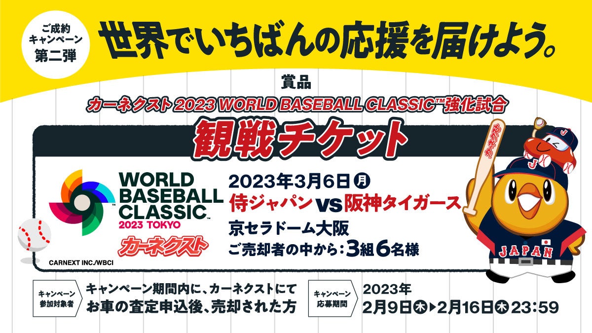 対象期間内にカーネクストでお車を売却された方の中から抽選で3組6名様に、2023年3月6日(月)に京セラドーム大阪で開催される『カーネクスト2023 WORLD BASEBALL CLASSIC™強化試合』の侍ジャパンVS阪神タイガース戦の観戦チケットをプレゼントいたします。