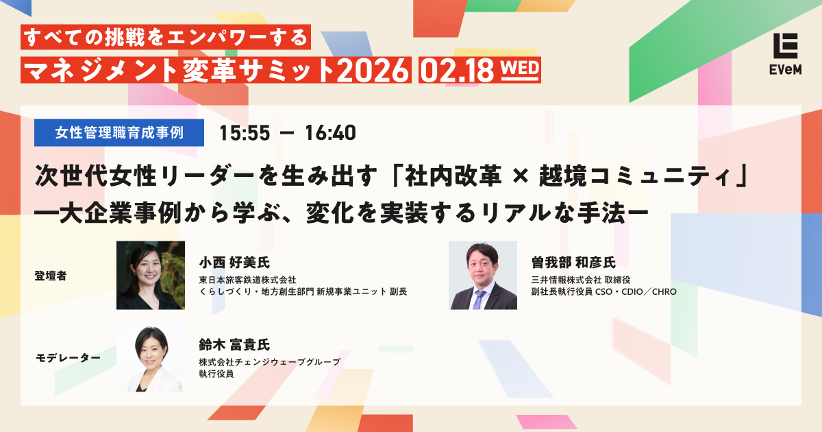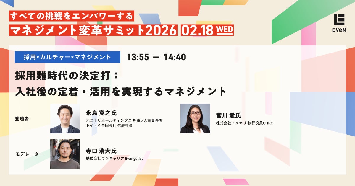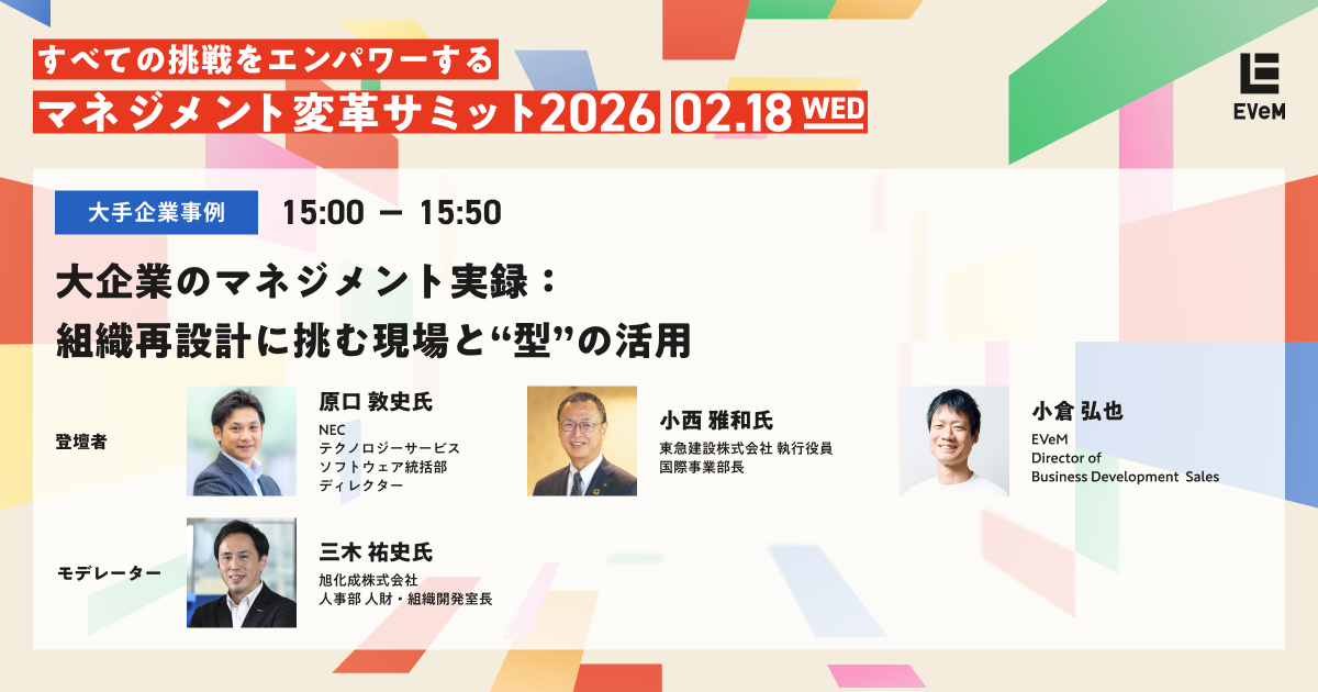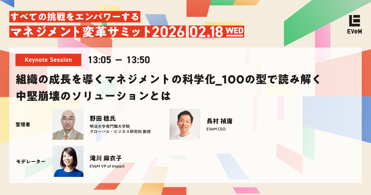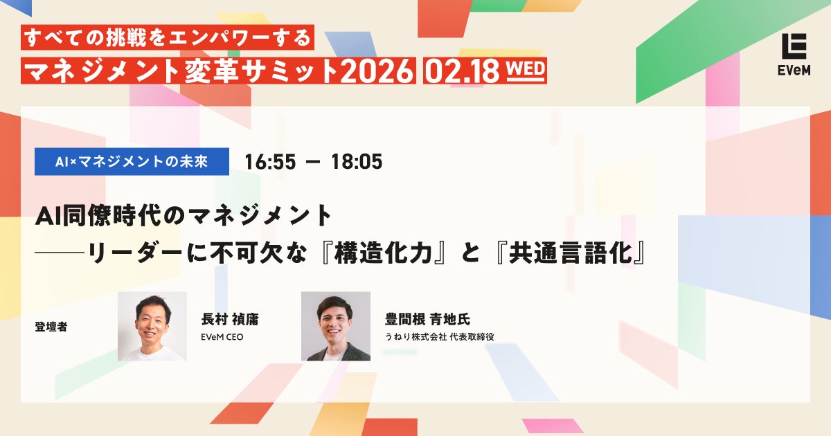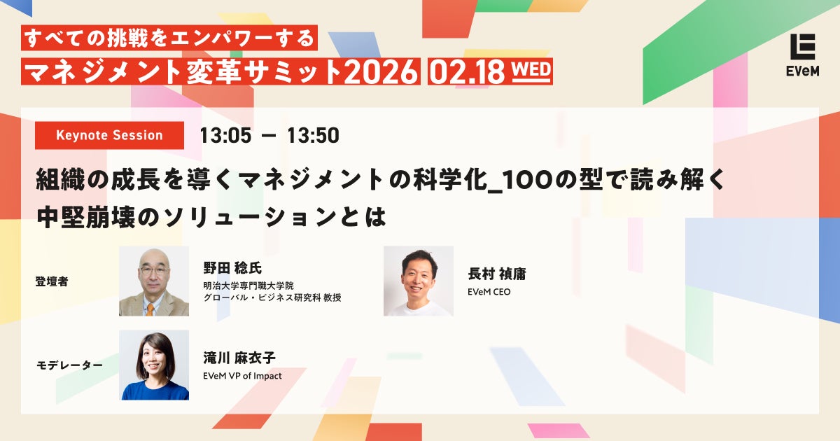 マネージャーイネーブルメントサービスを提供する株式会社EVeM(本社:東京都新宿区、代表取締役:長村 禎庸)は、2026年2月18日(水)、コングレスクエア日本橋にて、「マネジメント変革サミット2026 ーすべての挑戦をエンパワーする」を初開催します。会場参加が抽選制(定員あり)のほか、オンライン参加も可能です。マネジメント変革の最前線を体感できる貴重な機会として、ぜひこの機会にご応募ください。