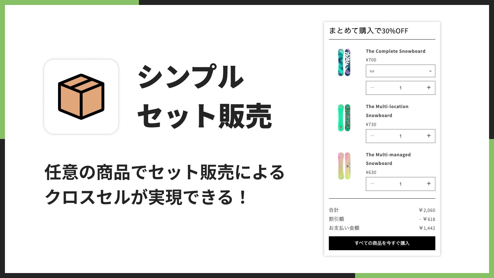 「シンプルセット販売|お手軽クロスセル」は、Shopify ストアにシンプルなセット販売を導入できるアプリです。「シンプルセット販売|お手軽クロスセル」を利用すれば、Shopify ストアで商品のセット販売を実現できます。