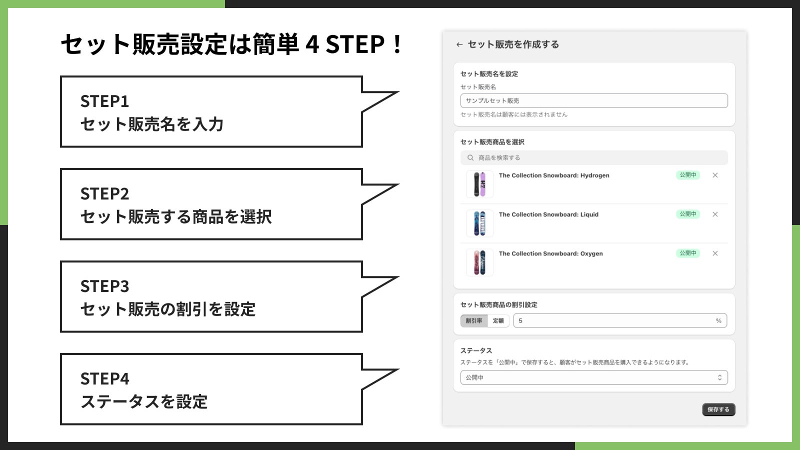 「シンプルセット販売|お手軽クロスセル」のセット販売設定は、以下の 4 STEPで簡単に設定できます。