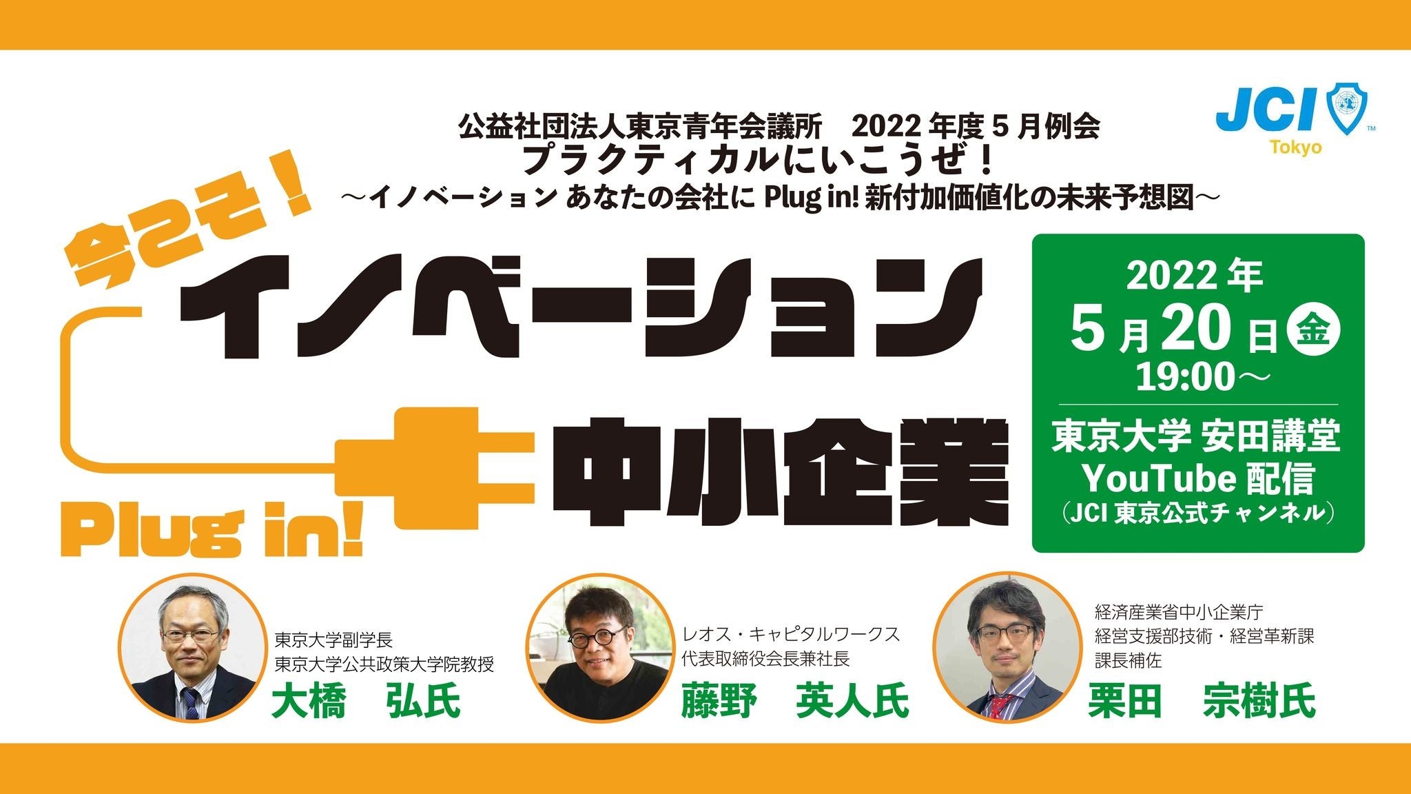 公益社団法人東京青年会議所(所在地:東京都千代田区平河町、理事長:山本健太)は、2022年5月20日(金)19時から、中小企業庁後援のもと、「5月例会 プラクティカルにいこうぜ!~イノベーション あなたの会社に plug in! 新付加価値化の 未来(ニュー)予想図(マップ)~」を、東京大学大講堂にて開催します。当日はYouTubeにて生配信を行い、事業開催後にはアーカイブ配信も行います。