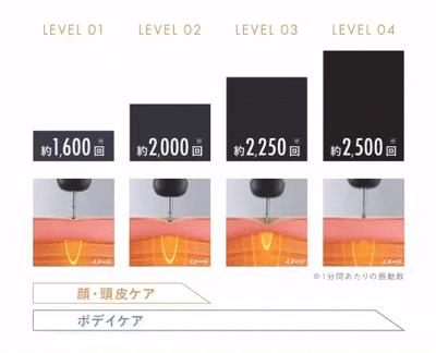 4段階の振動レベルを搭載し、肌の状態やお好みに合わせたケアが可能です。