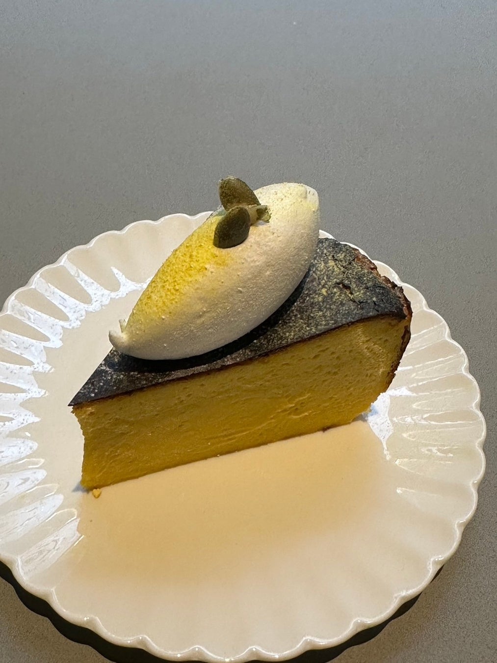 滑らかなプレーン生地に、削ったトリュフとオイルで華やかな香りを纏わせ、大人なバスクチーズケーキに仕上げました。お酒と一緒にお召し上がりいただくのもおすすめです。