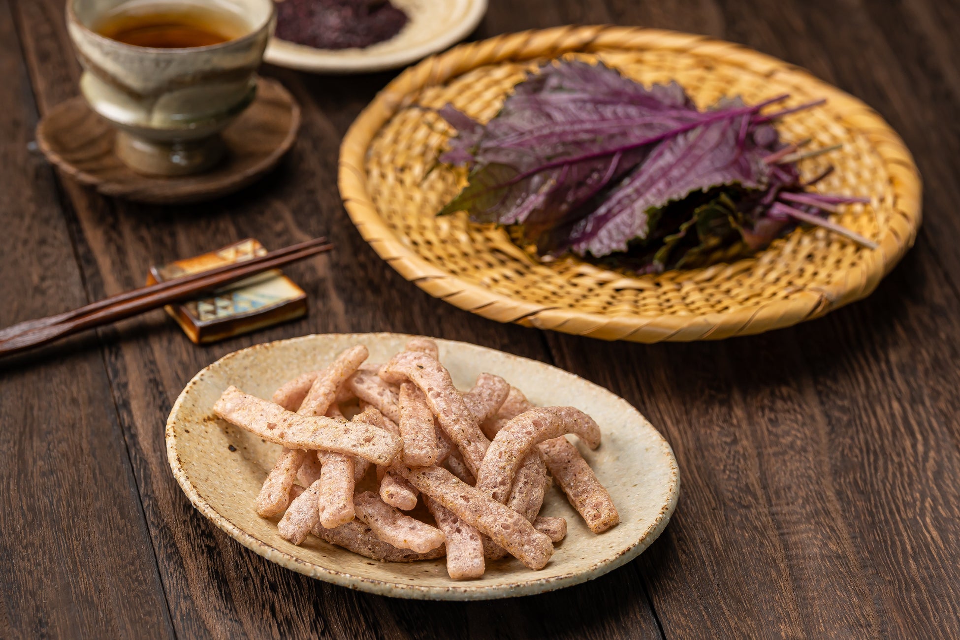 特長 :「タナカの赤しそ」をそのまま生地に練り込んだスナック菓子です。赤しその爽やかな風味と程よい塩味を生かしたサクサクの軽い食感が魅力。