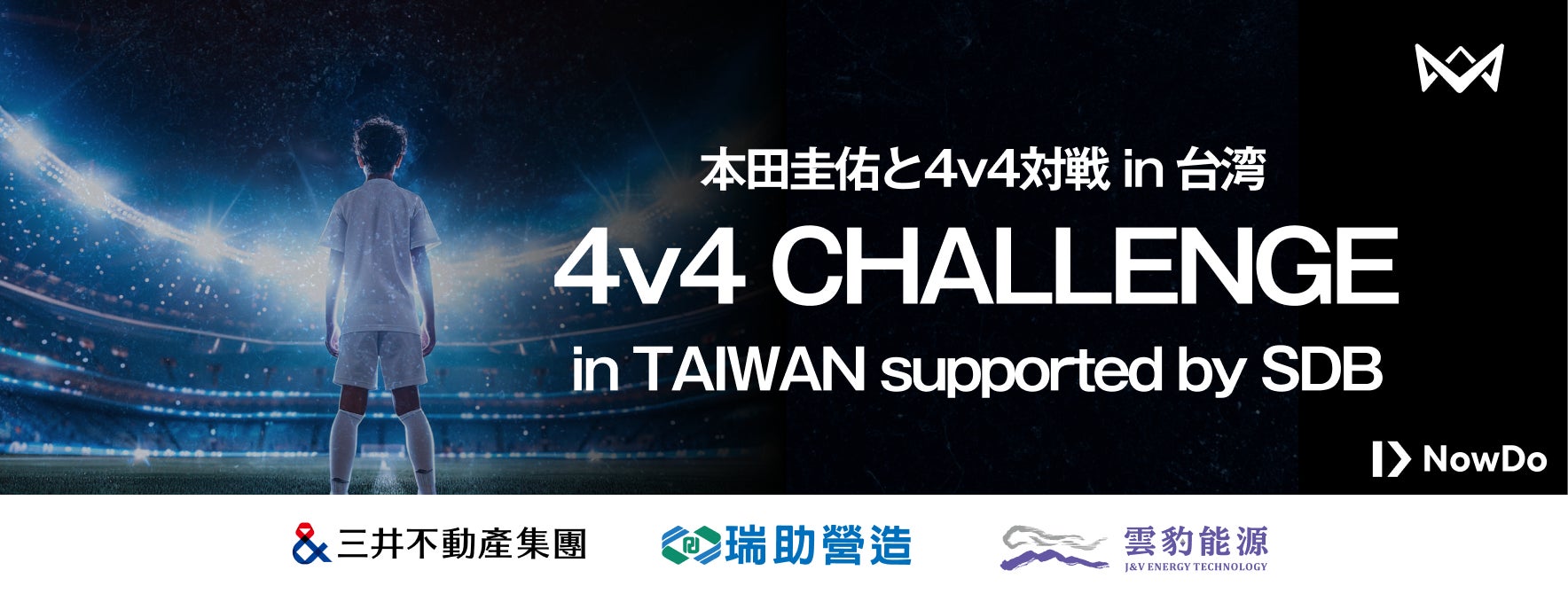 Now Do株式会社(所在地:東京都新宿区、代表取締役社長:本田圭佑)が運営する、育成年代の小学生の子どもを対象にした4人制のサッカー全国大会「4v4」を、スポーツ・健康事業を展開する台湾思動邦有限公司(所在地:台湾・台北市、代表取締役社長:石塚大輔)とパートナーシップ契約を締結し、5月25日(土)に台湾・台北市にて「4v4 CHALLENGE in TAIWAN supported by SDB」を開催することをご報告いたします。本イベントは、多くの子どもたちが4v4を楽しんでいただくことを目的に、第一部はご来場いただいた子ども達でチームを作り4v4を体験いただきます。第二部では、サッカー界のレジェンドである本田圭佑率いる大人チームに挑む、4v4形式でのスペシャルマッチを予定しております。