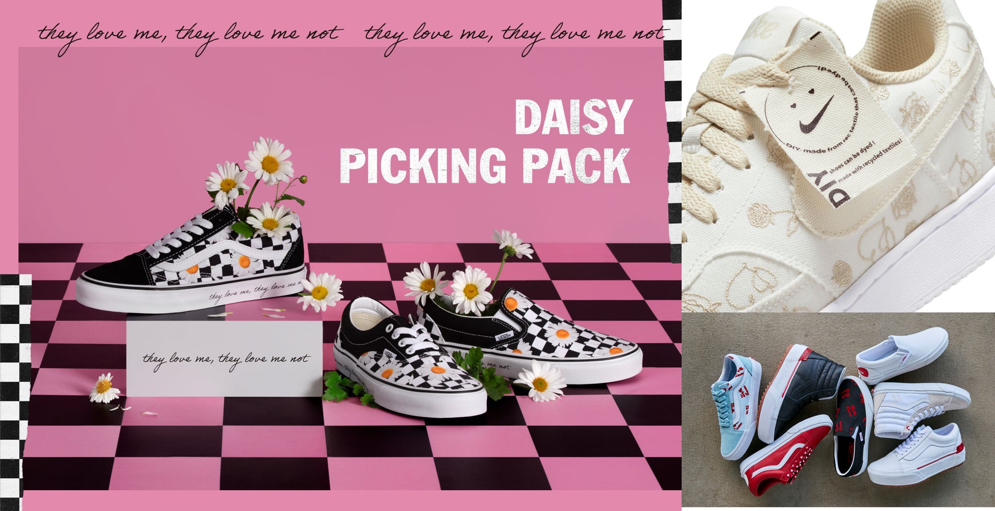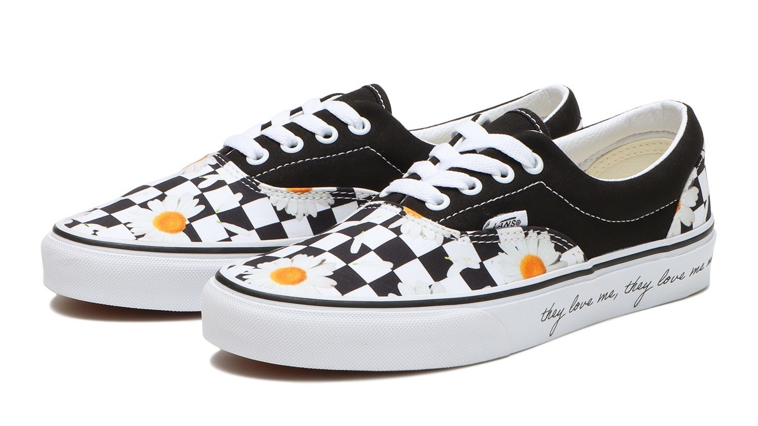 Vansのアイコンであるチェッカーボードパターンにデイジーのプリントが施されたアッパーを使用したOld Skool、Era、Slip-Onの“DAISY PICKING”Pack。“花びら占い”からデザインインスピレーションを受けており、“花びら占い”でよく使われるデイジーをアッパーにプリント。アウトソールにプリントされた “Love Me, Love Me Not”は和訳すると「好き、嫌い、好き、嫌い、好き…」の意味となっており、“愛を祝い伝える日”にピッタリのメッセージが込められたデザインとなっています。
