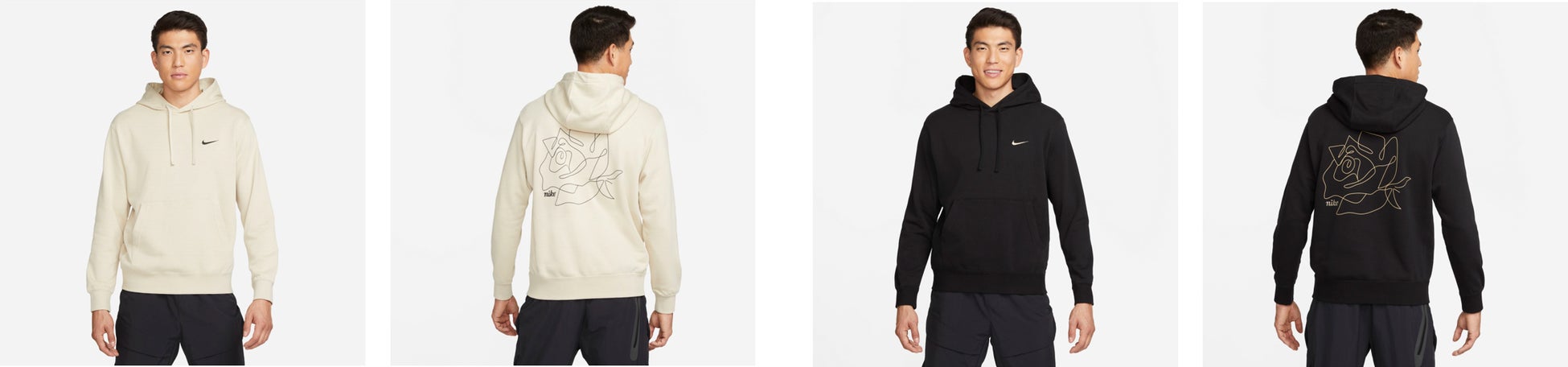 また、フロントにNIKEのロゴをワンポイント、背面にはシンプルながら大胆なバラのグラフィックを配置したフーディもラインナップ。