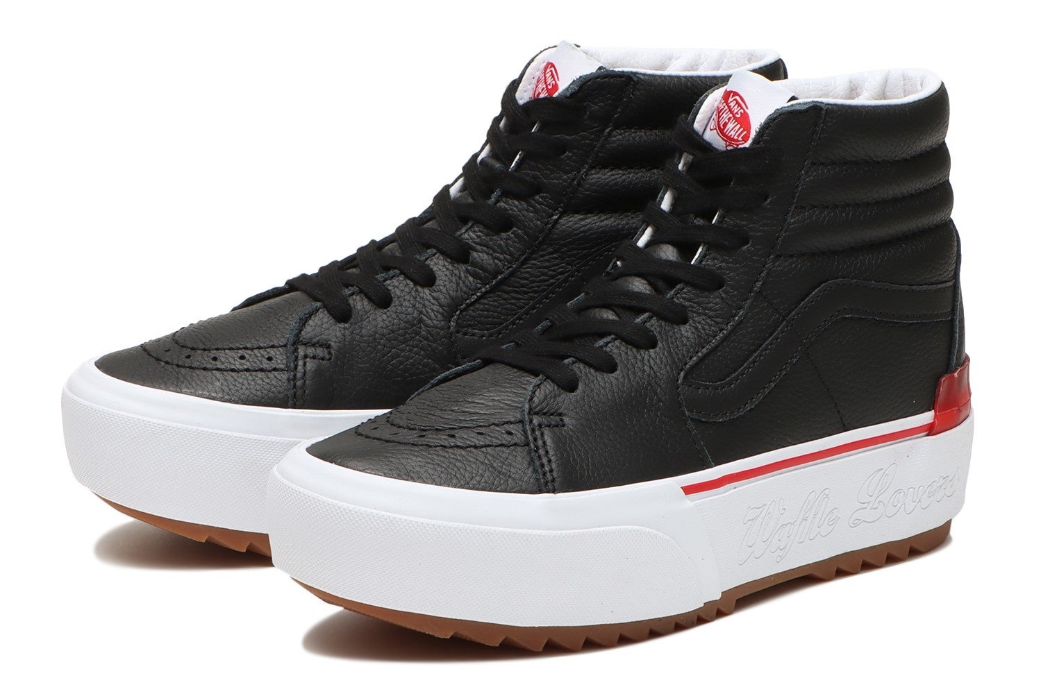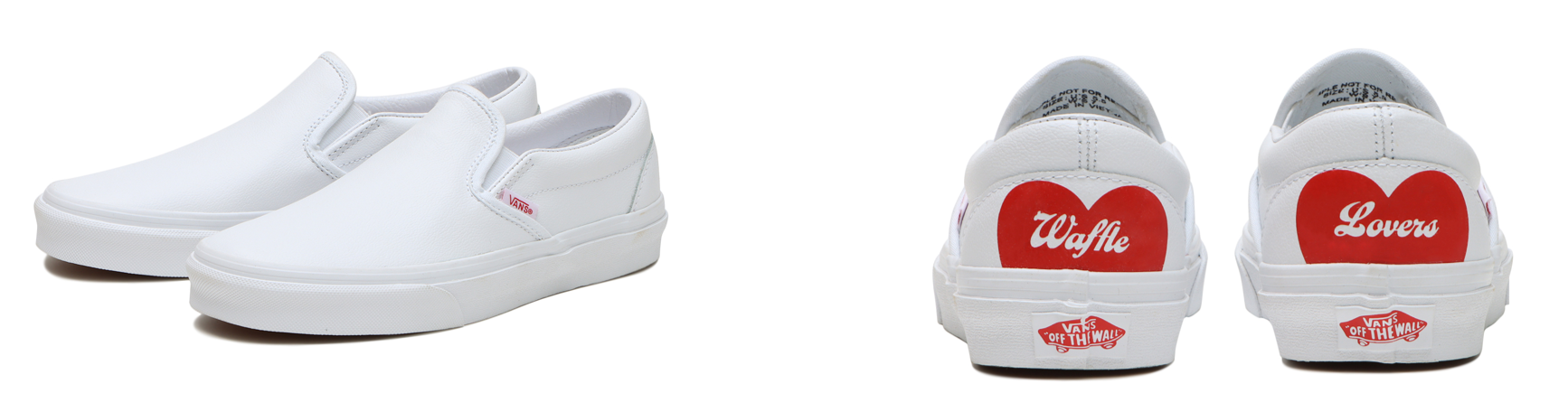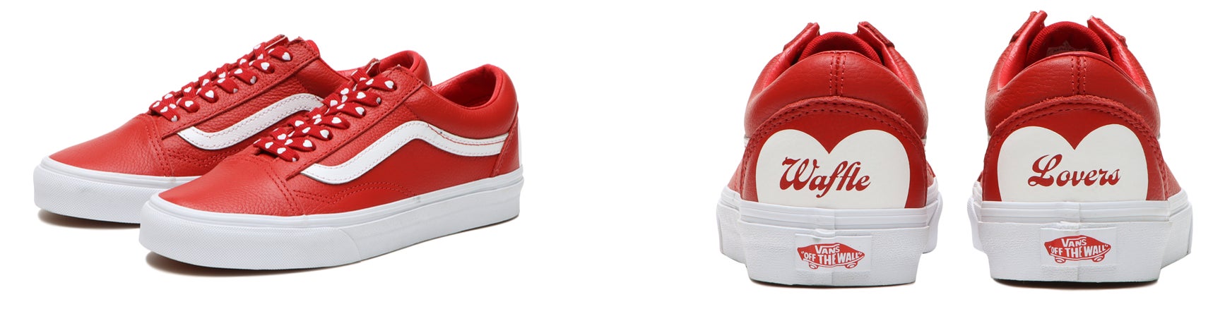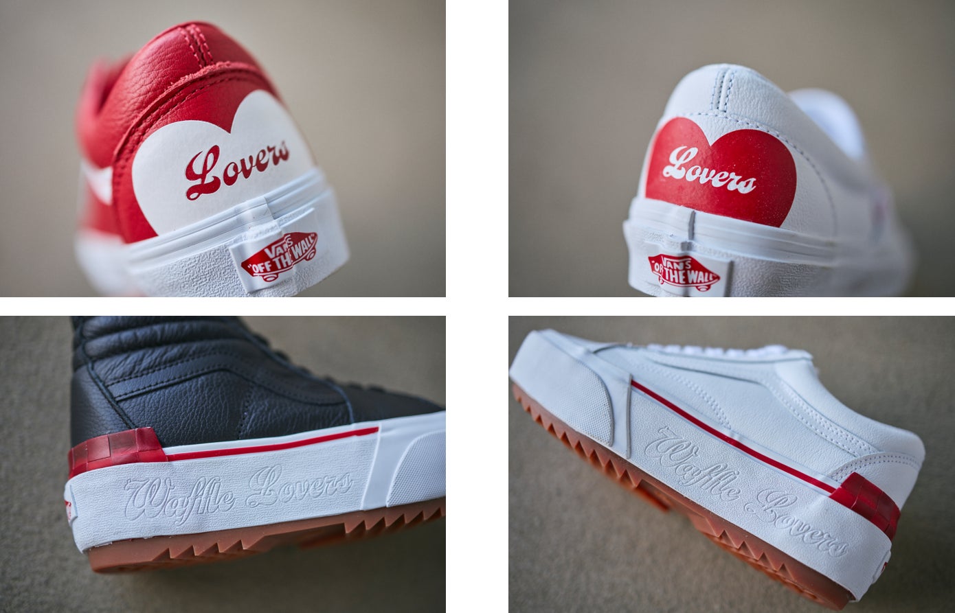 また、アウトソールに“Waffle Lovers”のエンボス加工を施しスタックソールを使用した厚底のSk8-HiとOld Skool、ヒールに“Waffle Lovers”のプリントと半分になったハートの上部が除くOld SkoolとSlip-Onの4足をオールレザーで展開。