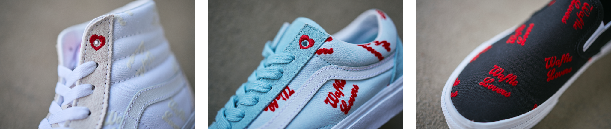 Sk8-Hi、Old Skool、Slip-Onのクラシックシルエットをベースに、"Waffle Lovers"のフロッキープリントとガーリーなカラーパターンのアッパーを採用し、ハート型のシューホールの遊び心が嬉しい3足がラインアップ。