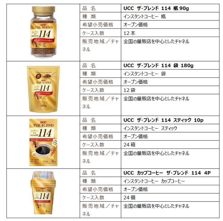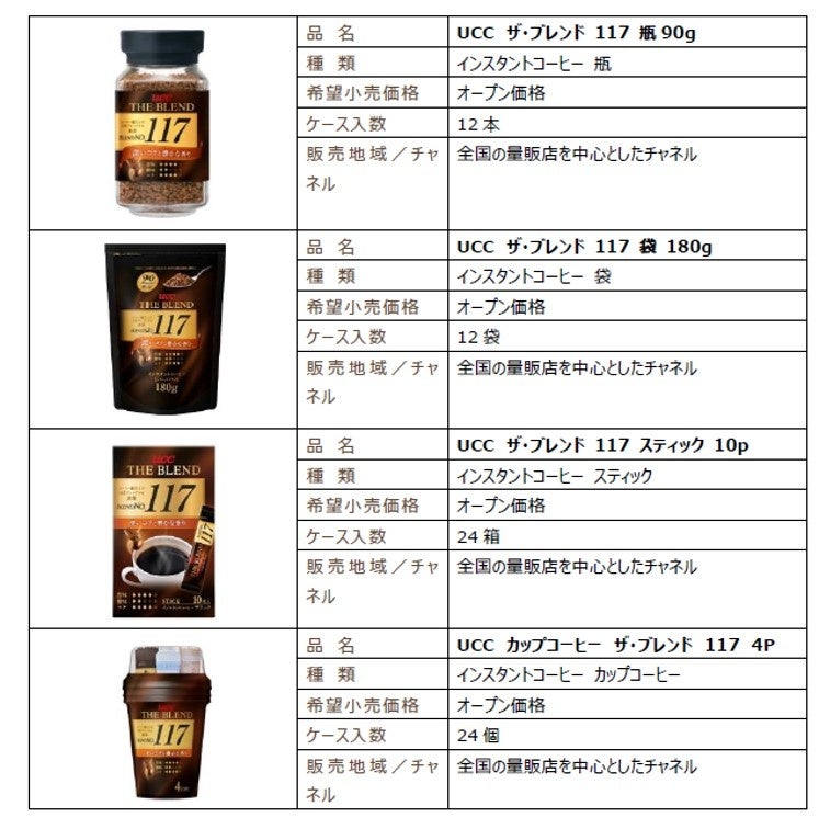 UCC上島珈琲株式会社(本社/兵庫県神戸市、資本金/10億円、社長/朝田文彦、以下UCC)は、コーヒー鑑定士が500種類のブレンドの中から選び抜いた2つの味わいを楽しめるインスタントコーヒー『UCC THE BLEND 114・117』シリーズ全8品の味覚とパッケージをリニューアルし、9月1日(木)に全国で発売します。