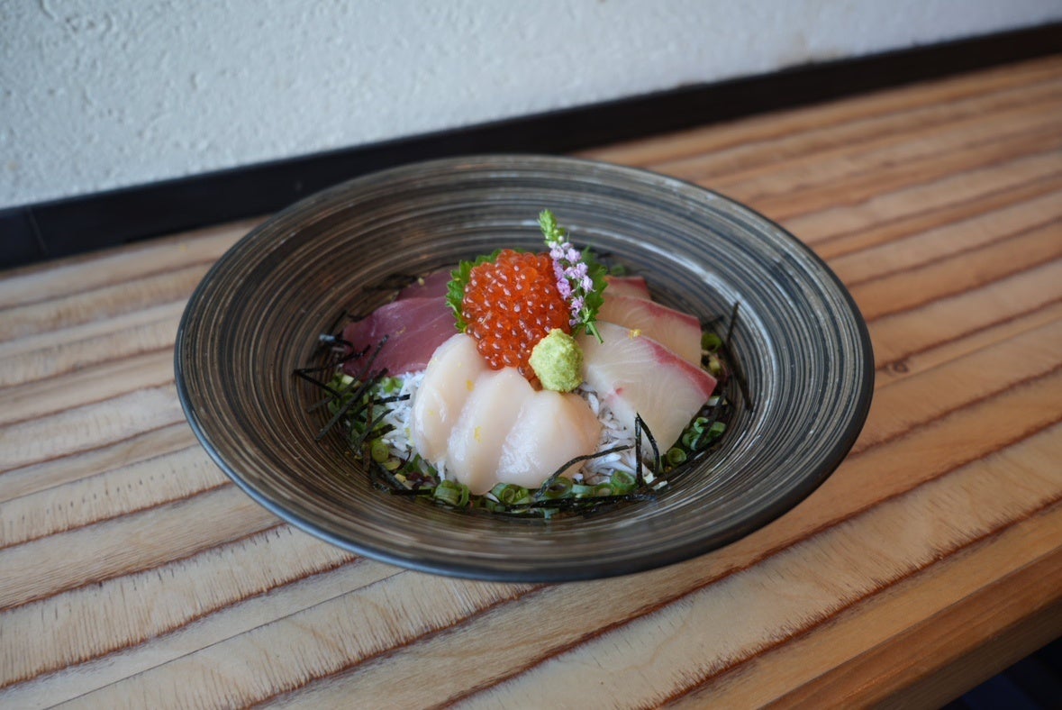 山利の釜あげしらすに、マグロ、ぶり、ホタテ、シラリカいくらを合わせた贅沢丼。水揚げ後、新鮮なうちにふっくらと釜あげされた山利のしらすをふんだんに使用し、ねぎと花穂の香りがアクセントに。味噌汁、漬物がついた定食スタイルで提供します。