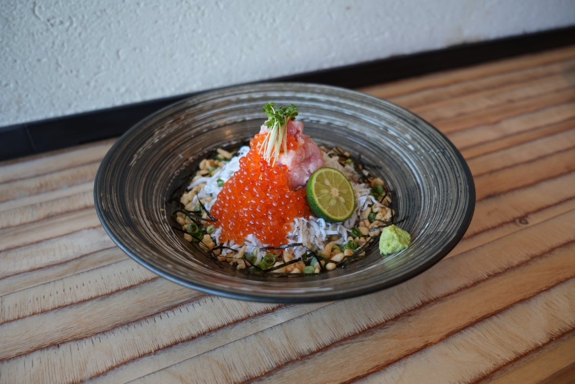 ふっくらと釜あげされた山利のしらすをふんだんに使用し、アクセントとして揚げ玉を合わせました。食感の残る粗めのネギトロに、50グラムのたっぷりのシラリカいくらを大胆にトッピング。酢橘を絞ってさっぱりとお召し上がりいただける一品に仕上げました。