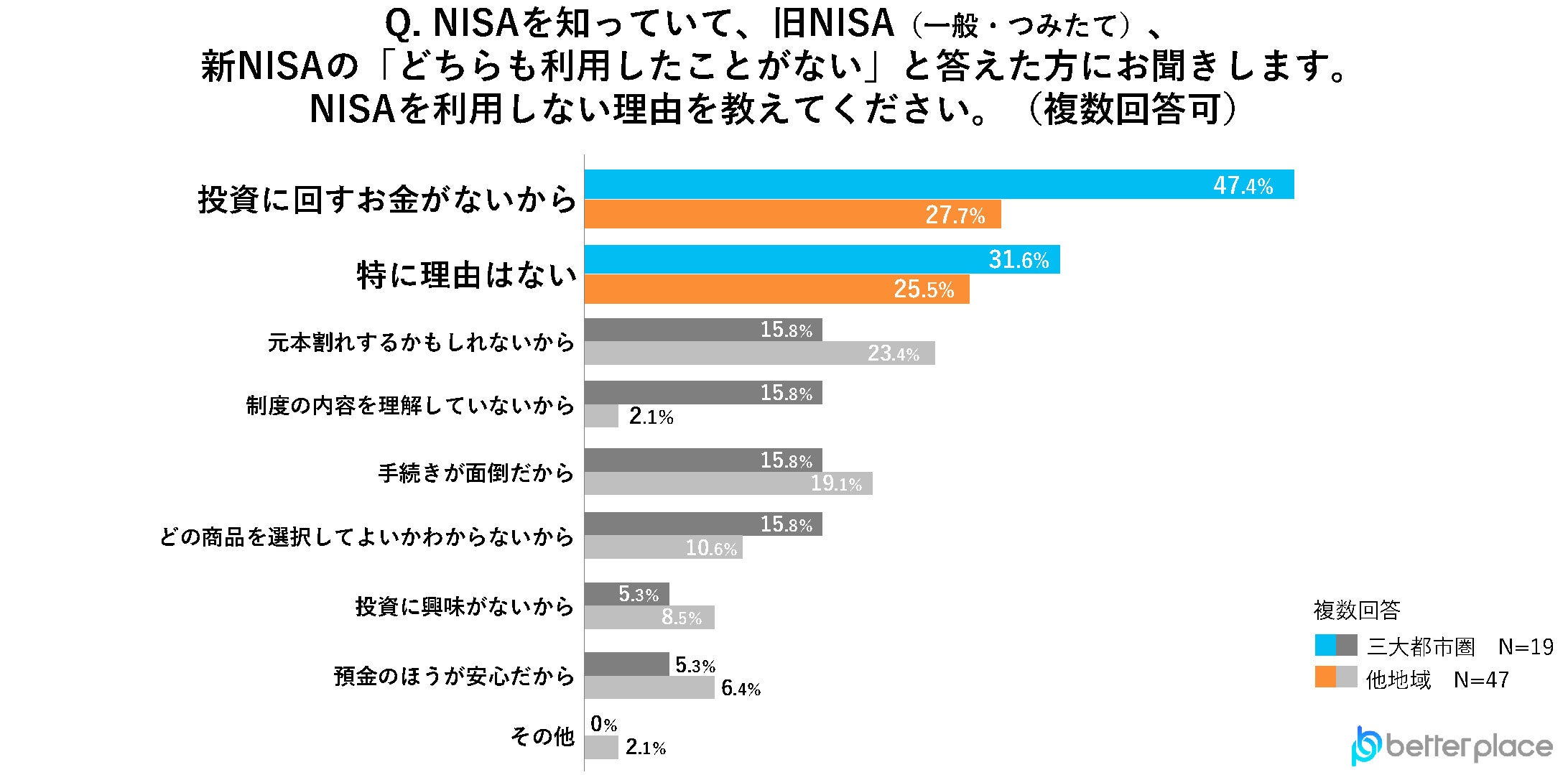 NISAを知っていてもこれまで利用したことがない人に、利用しない理由を聞いたところ、「投資に回すお金がないから」が三大都市圏で47.4%、他地域で27.7%と共に1位、また、三大都市圏、他地域共に「特に理由はない」が2位という結果となりました。