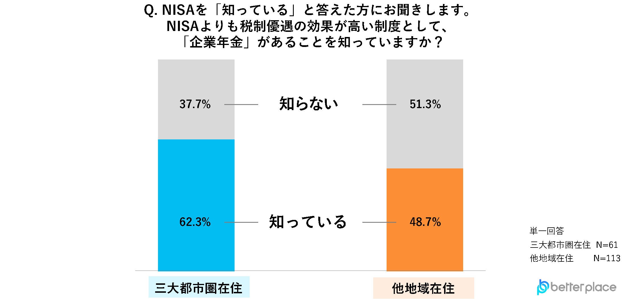 NISAを知っている人に、NISAよりも税制優遇の効果が高い「企業年金」を知っているか聞いたところ、「知っている」と答えた人は、三大都市圏で62.3%、他地域で48.7%と、三大都市圏が13.6ポイント高いことが分かりました。