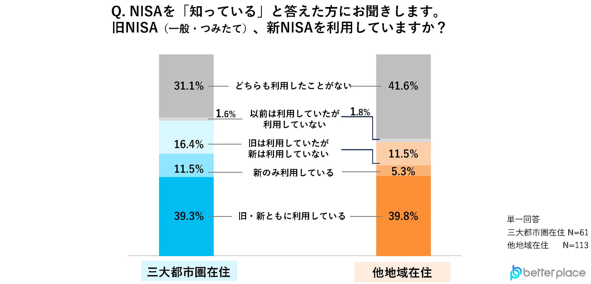 NISAを知っている人に利用状況を聞いたところ、「新NISAを利用していない」(旧NISAは利用していたが新NISAは利用していない/以前は利用していたが利用していない/どちらも利用したことがない)と答えた人は、三大都市圏で49.1%、他地域では54.9%でした。旧・新NISAを「どちらも利用したことがない」と答えた人は、三大都市圏では31.1%、他地域では41.6%と10.5ポイントの差がありました。