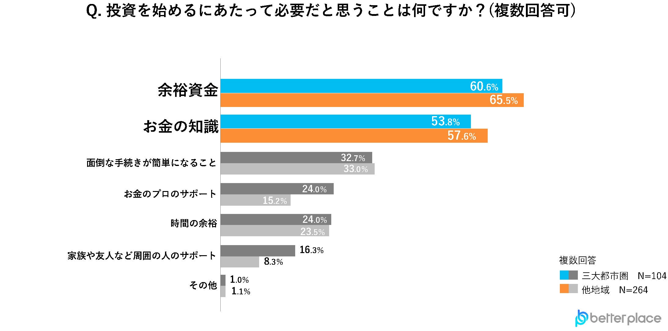 投資を始めるにあたって必要だと思うことを聞いたところ、「余裕資金」と答えた人が三大都市圏で60.6%、他地域で65.5%と共に1位という結果となりました。また、「お金の知識」と答えた人も共に2番目に多い結果となりました。