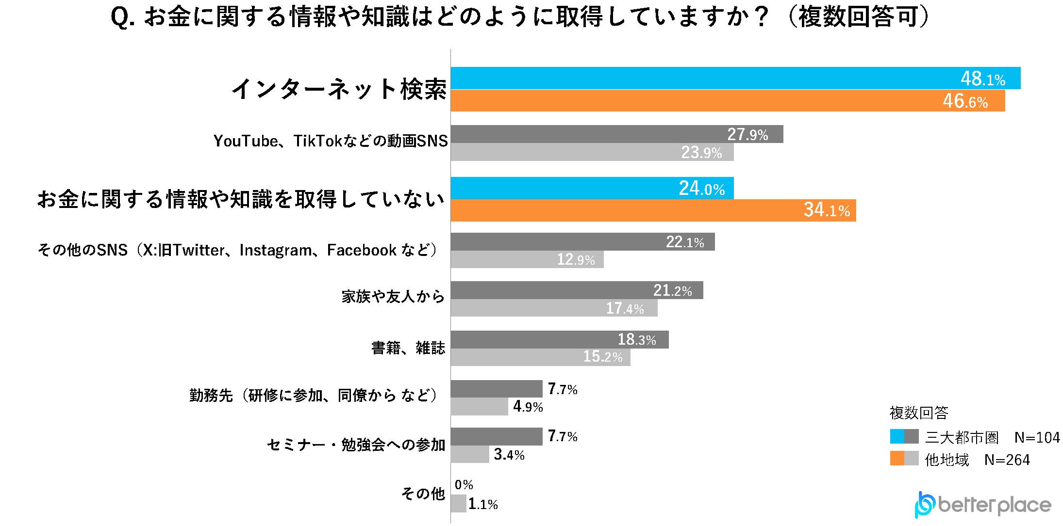 お金に関する情報や知識をどのように取得しているか聞いたところ、「インターネット検索」が三大都市圏で48.1%、他地域で46.6%と共に1位となりました。「お金に関する情報や知識を取得していない」と答えた人は、他地域が34.1%と三大都市圏の24.0%を10.1ポイント上回る結果となりました。
