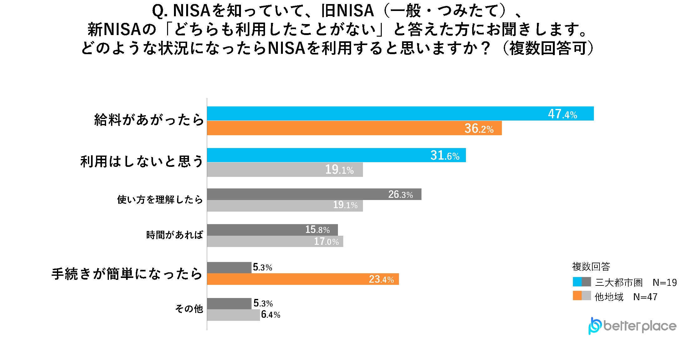NISAを知っていてもこれまで利用したことがない人に、どのような状況になったらNISAを利用するのか聞いたところ、「給料があがったら」と答えた人が三大都市圏で47.4%と約半数、他地域でも36.2%で共に1位という結果となりました。さらに三大都市圏では「利用はしないと思う」と答えた人が2番目に多く、他地域より12.5ポイント高い31.6%でした。