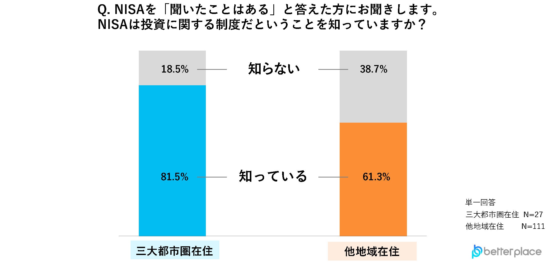 NISAについて「聞いたことはある」という人に、NISAが投資に関する制度であることを認識しているか調査したところ、「知っている」と答えた人は三大都市圏では81.5%、他地域では61.3%という結果となりました。