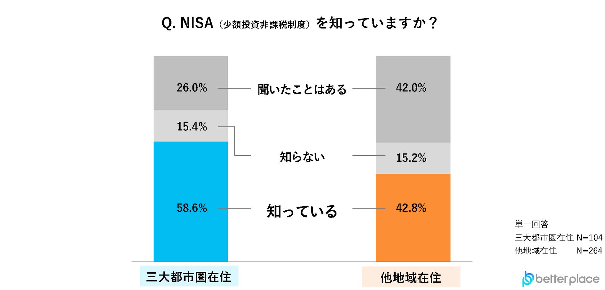 NISAの認知度を調査したところ、知っていると答えた人は三大都市圏で58.6%、他地域では42.8%と15ポイント以上の差がありました。