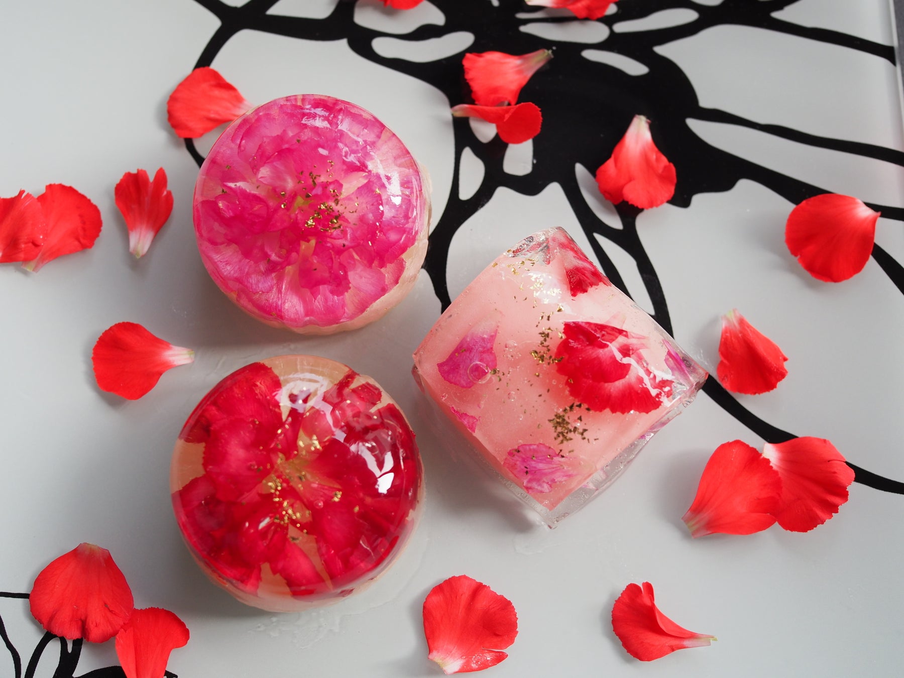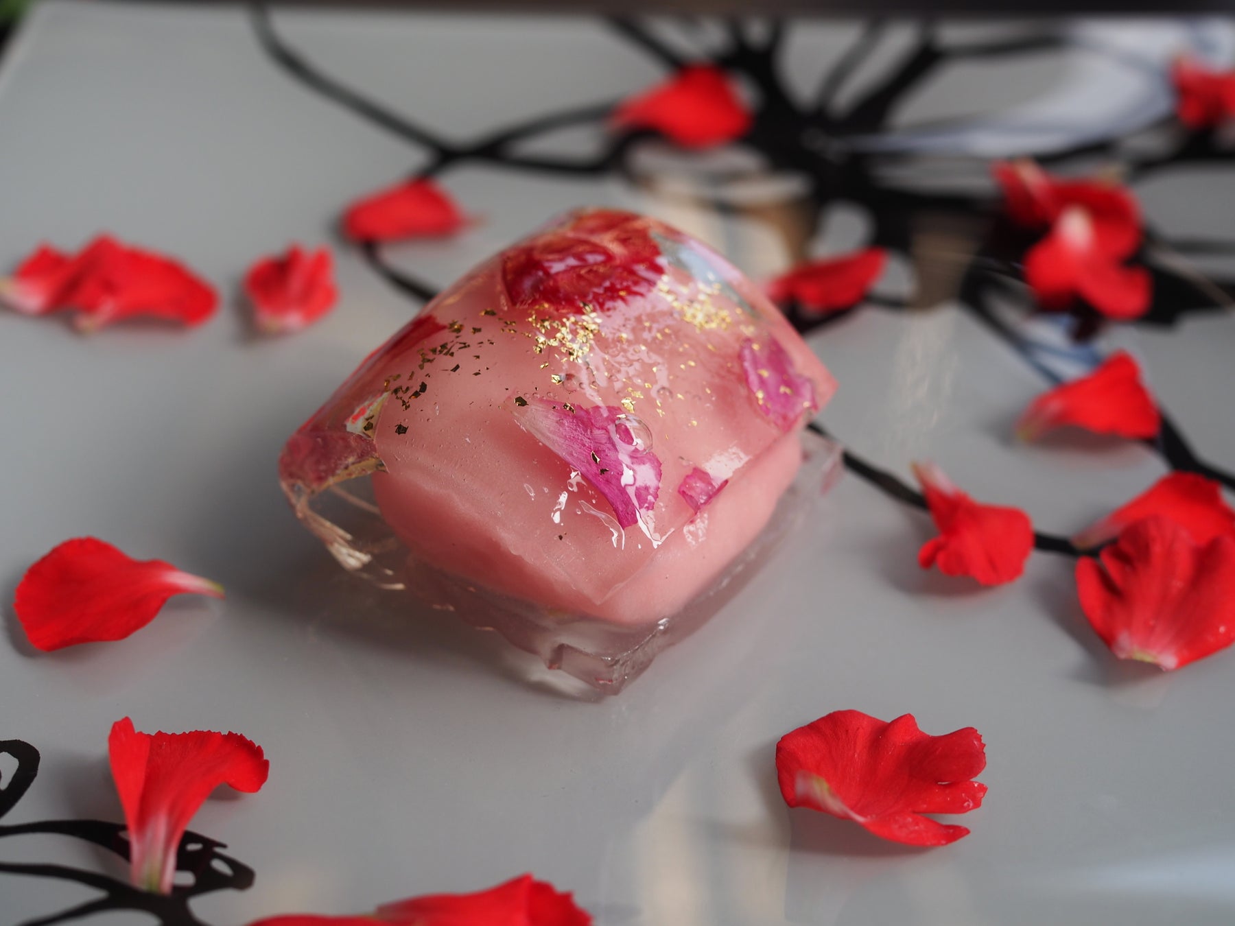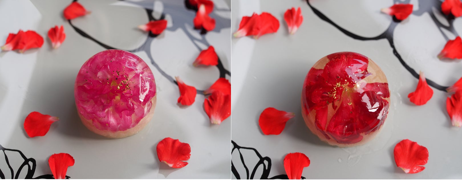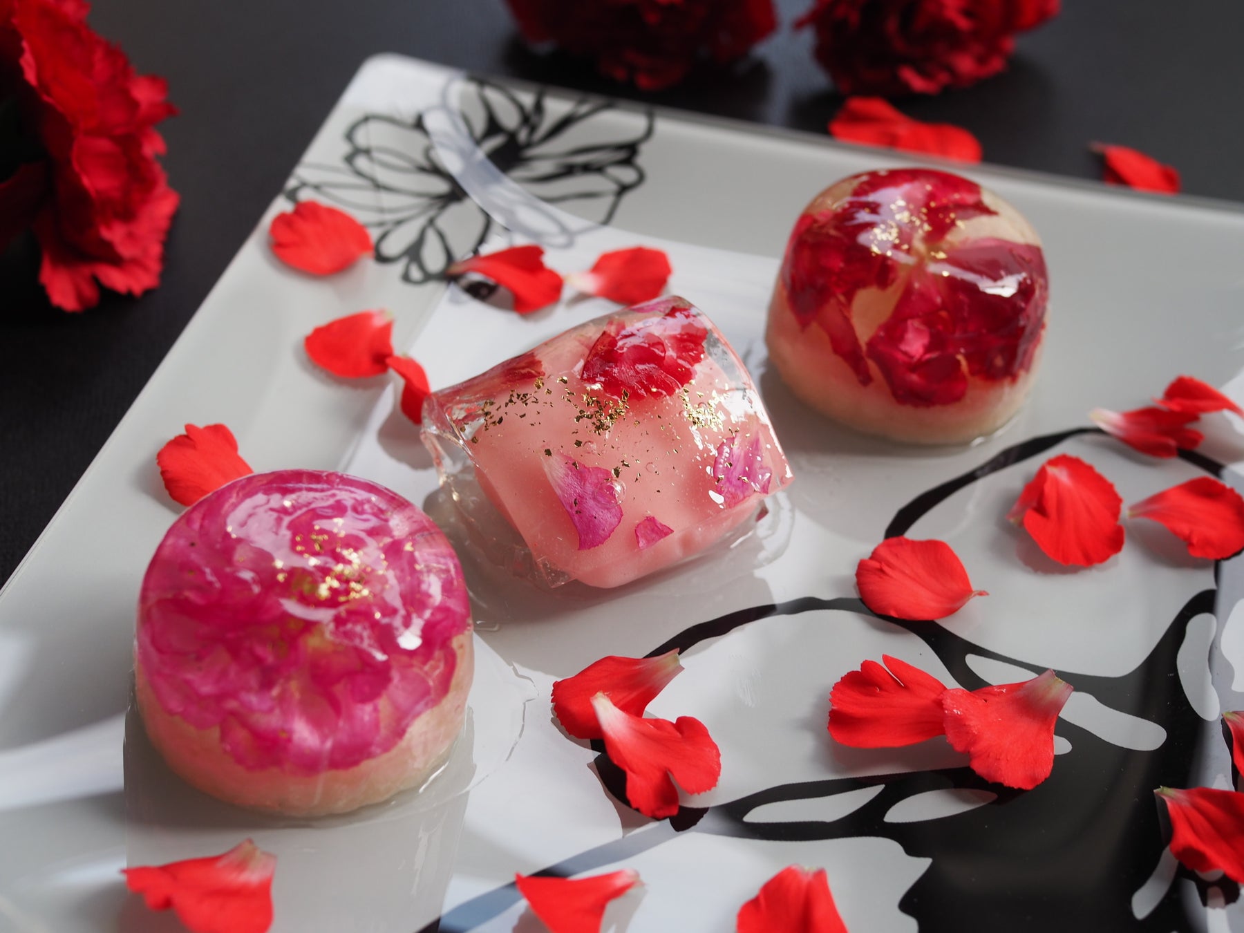 カーネーションの花びらを錦玉羹(寒天に砂糖を入れて固めたもの)に散りばめ、淡いピンク色に着色した白餡に巻きました。仕上げに斜めに金箔をふりかけ、「輪」とはまた違った躍動感があるエレガントな和菓子に仕上げました。
