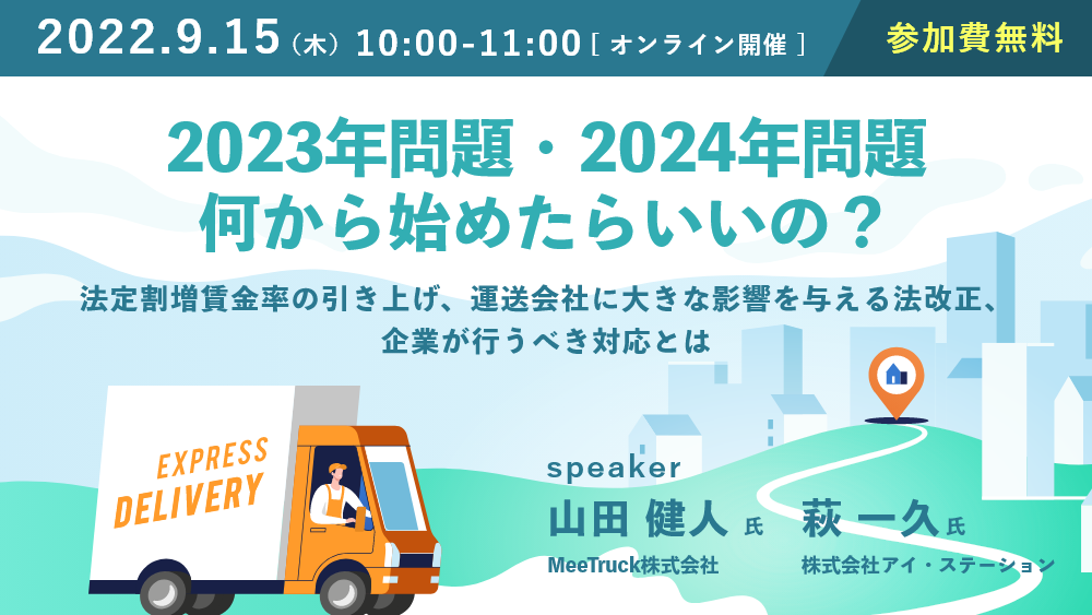 2022年9月15日(木)オンラインセミナー開催のお知らせ2023年問題・2024年問題何から始めたらいいの? ~法定割増賃金率の引き上げ、運送会社に大きな影響を与える法改正、企業が行うべき対応とは~