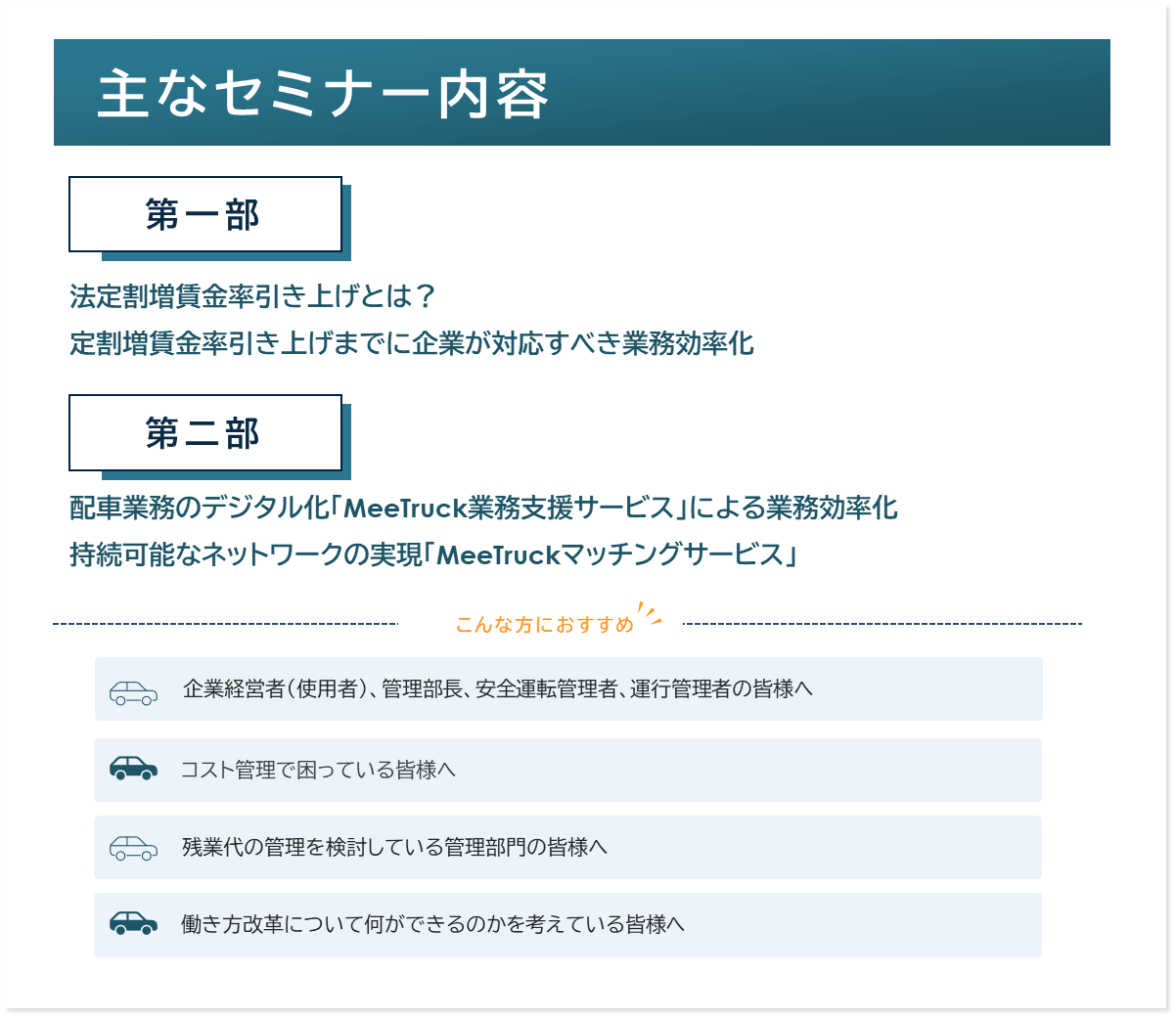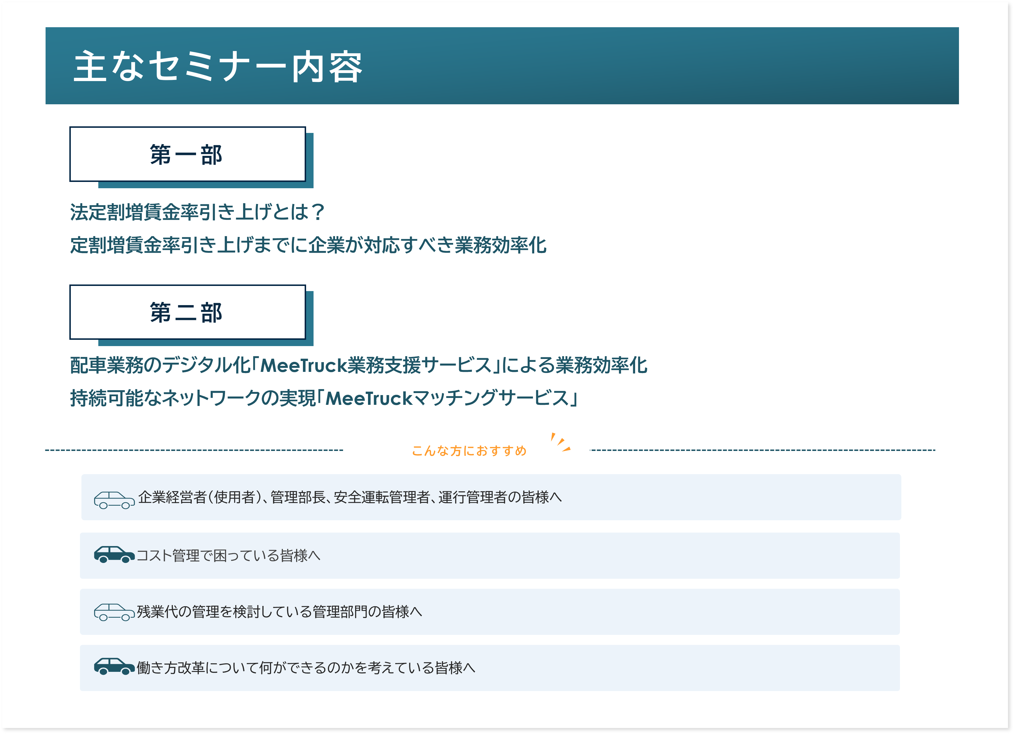 本セミナーにおいて、第一部では法廷割増賃金引き上げについて、また適用されるまでに企業が対応すべき業務効率化についてお伝えいたします。また第二部では運送業界の業務効率化の一端を担う配車業務のデジタル化サービスである「MeeTruck業務支援サービス」と持続可能なネットワークの実現をサポートする「MeeTruckマッチングサービス」のご案内をいたします。