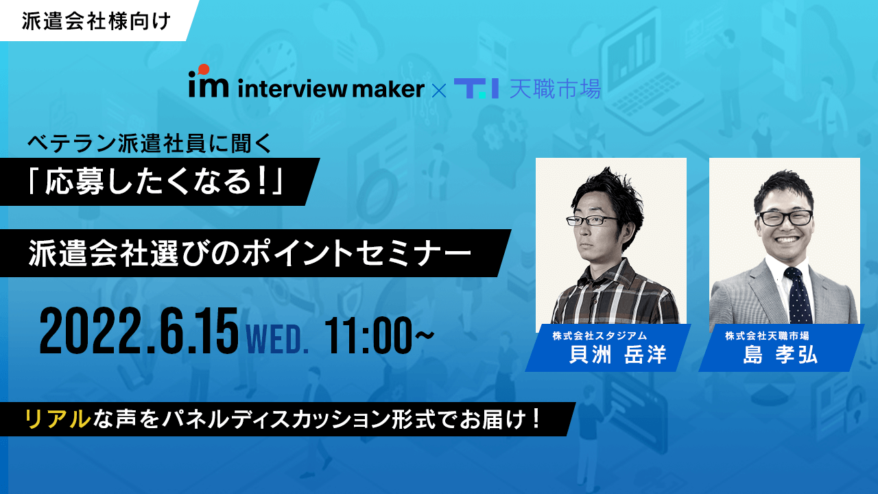 オンライン採用のコンテンツとコミュニケーションを支援する天職市場(本社:東京都新宿区西新宿、代表取締役:森部 浩史)は、2022年6月15日(水)にWEB面接特化型システム「インタビューメーカー」を提供する株式会社スタジアムと共催で、派遣会社の採用担当者向けWEBセミナー『~派遣会社様向け~ ベテラン派遣社員に聞く「応募したくなる」派遣会社選びのポイント』を開催いたします。