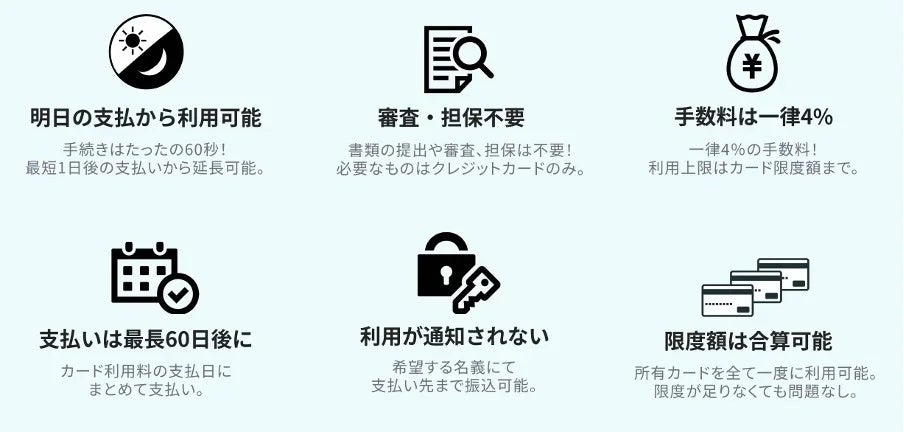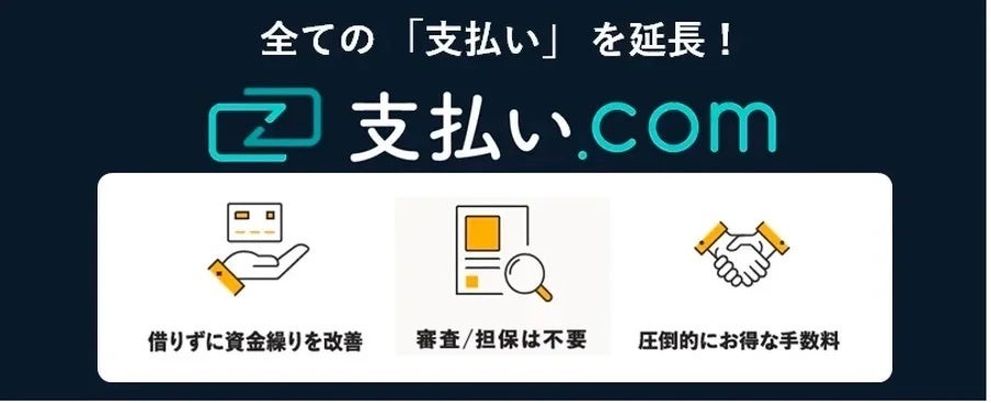 個人事業主・法人企業を対象とした「支払い.com」は、企業間の取引におけるあらゆる銀行振込のお支払いを、ユーザーがお持ちのクレジットカードで決済できるサービスです。お支払いをクレジットカードのお引落日まで延長することで、ユーザーは資金繰りの改善が可能となります。また、ユーザーは書類の提出や面談、審査は必要ありません。