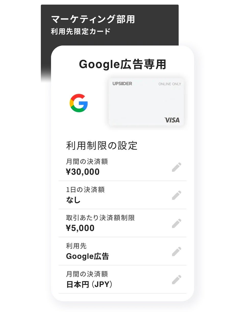 * UPSIDERは、月間決済額の上限や1日の決済額、取引あたり決済額、利用先サービス、通貨などをカードごとに制限できる「利用先限定機能」を標準装備しています。