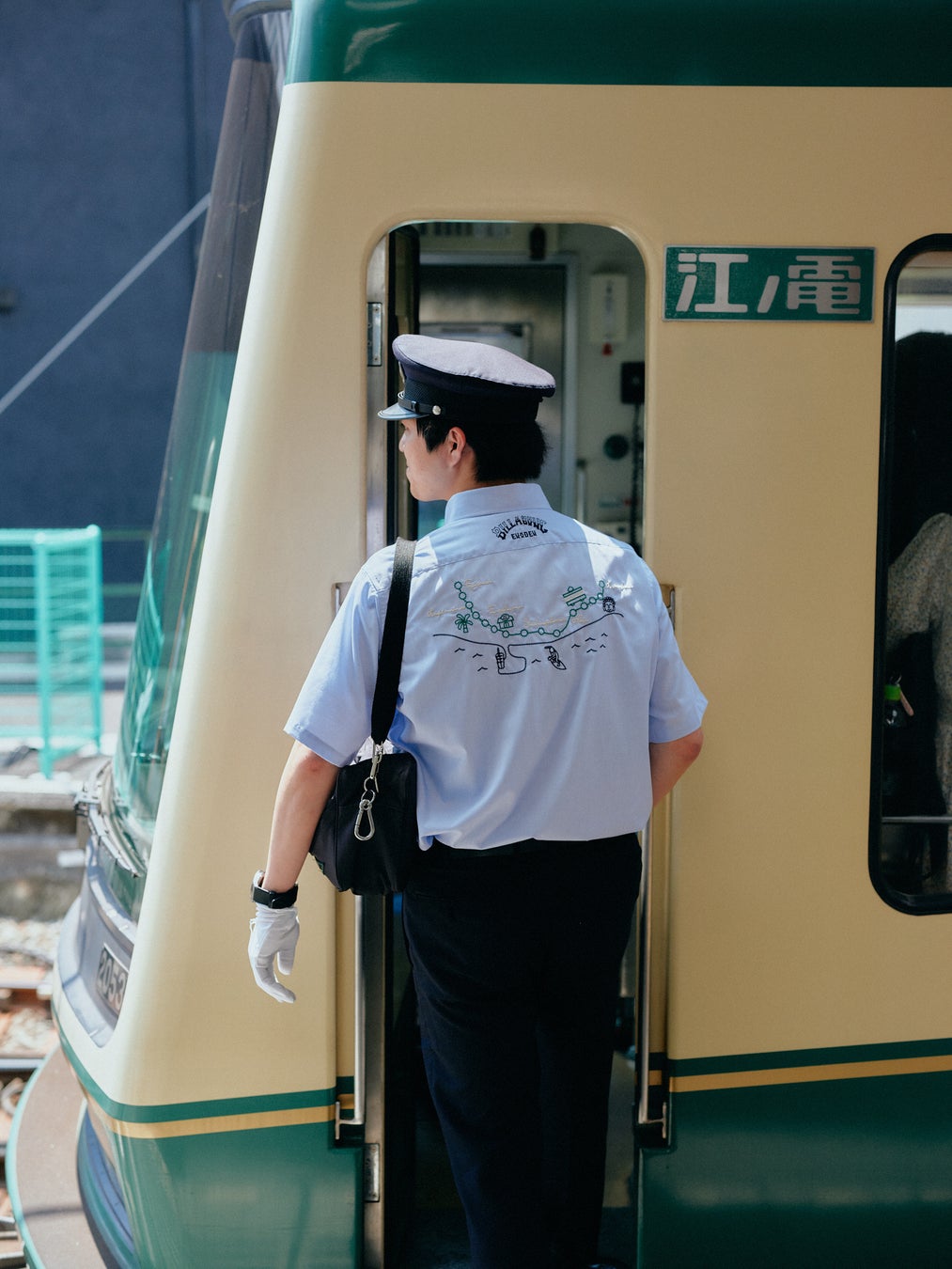 【 江ノ電史上初となるコラボ制服】 胸に2つのブランドロゴワッペン、背中には江ノ電の路線図が刺繍でデザインされた