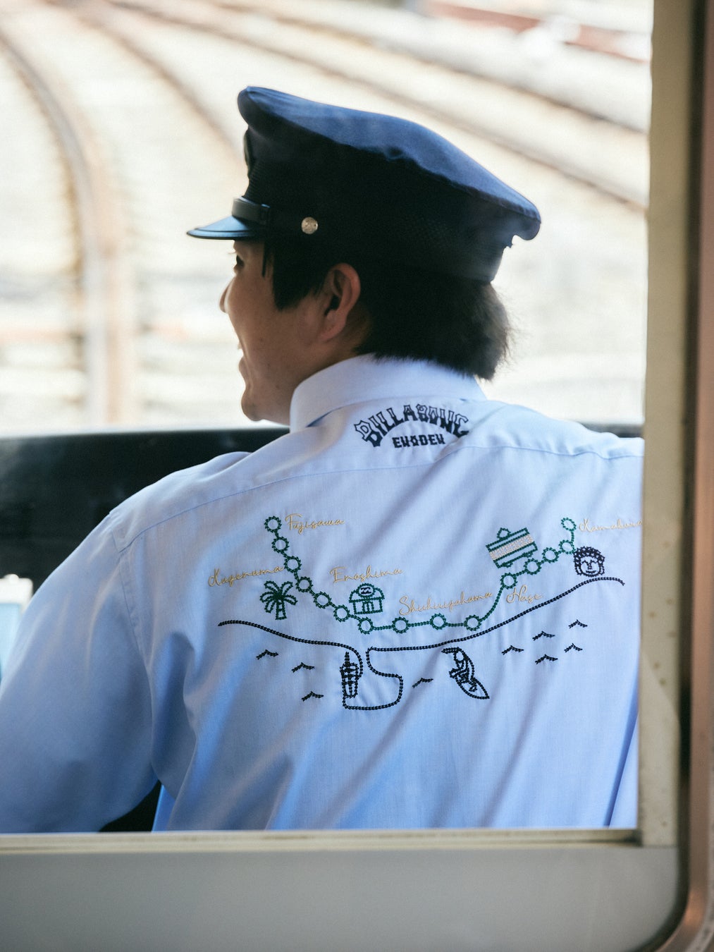 BILLABONGが手掛けた制服のボディに採用されたのは、同じ湘南発のブランド‘鎌倉シャツ’。吸水性が高く、しわになりにくい防縮性にも優れた素材が特徴。「江ノ電」「BILLABONG」それぞれのブランドロゴワッペンが胸に配され、背中には江ノ電の路線図が手書き風刺繍で施された。運転手手帳が収納可能なサイズのポケットは、フラップ生地を厚くしたことで耐久性が高く、ペン刺しも付属した特別仕様のコラボ制服。