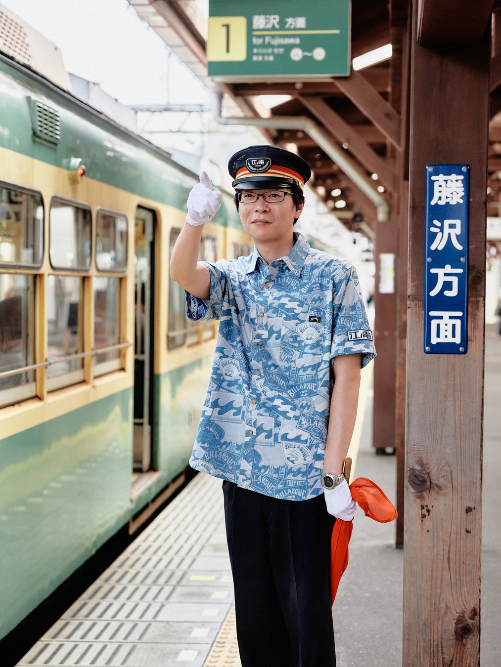 今回の江ノ電×BILLABONG地域共創プロジェクトでは、”コラボ制服”を江ノ電乗務員が着用するほか、江ノ電売店スタッフや駅員も、BILLABONG歴代ロゴがコラージュされた総柄デザインシャツを着用します。江ノ電乗務員の制服にブランドロゴが採用されるのは開業122年史上初の取り組みです。鎌倉高校前駅では、駅名看板やベンチ等も江ノ電売店スタッフや駅員と同様のBILLABONG総柄デザインに装飾されます。