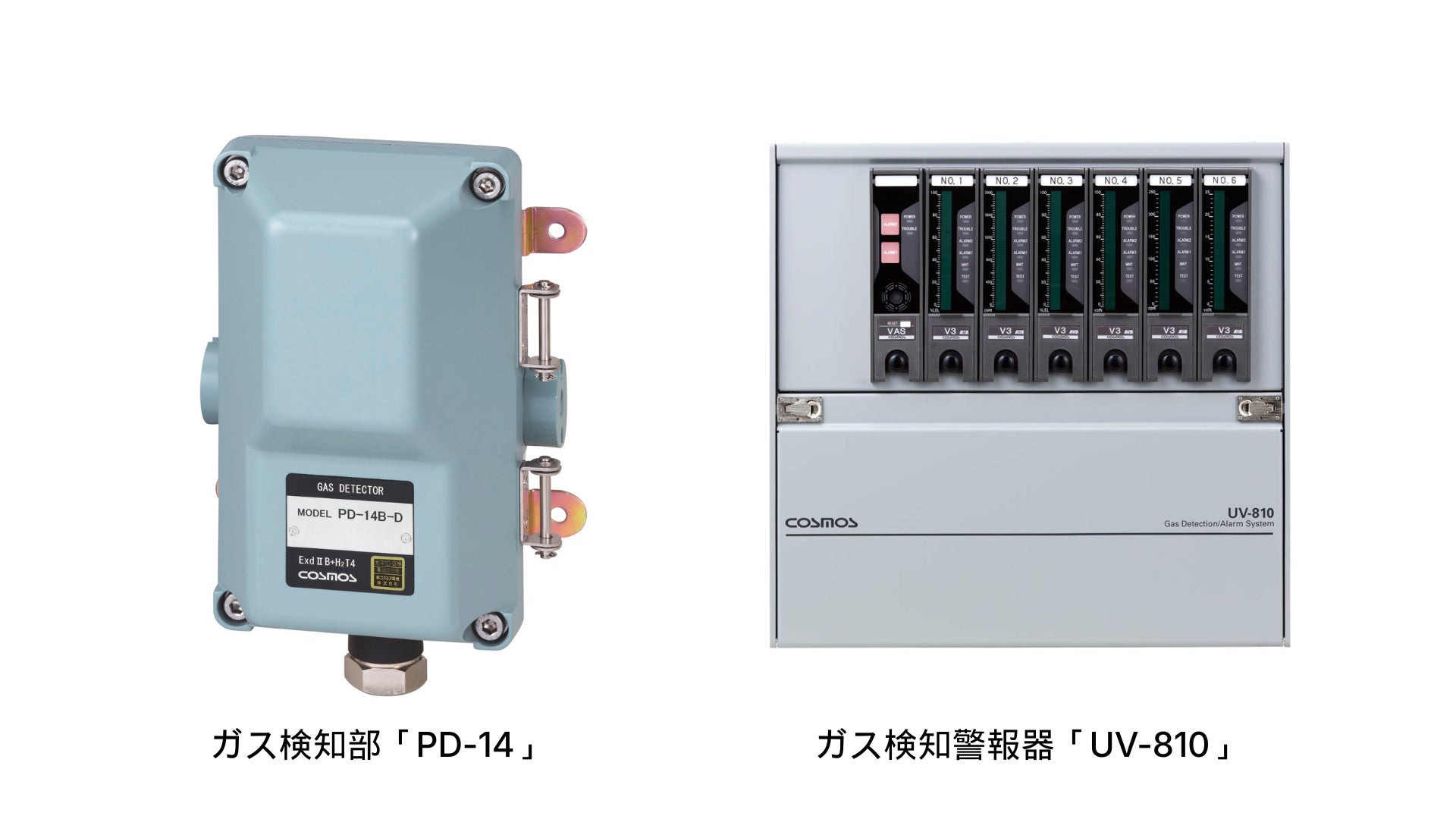 水素設備を当該プラントへ導入するにあたり、安全対策の一環として、新コスモス電機製の水素ガス検知器が採用され、「PD-14」が30点、15点式の「UV-810」が2点設置されました。また、冷凍機設備用として冷媒ガスを検知するガス検知部「PD-14」も導入されています。