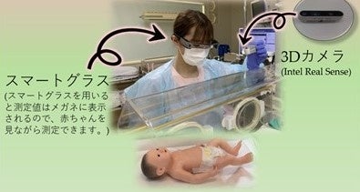 保育器の上方にある3Dカメラで撮影し、算出された体重等のデータは、撮影者(医療担当者)のスマートグラスで瞬時に見ることができる。 (写真:研究者提供)