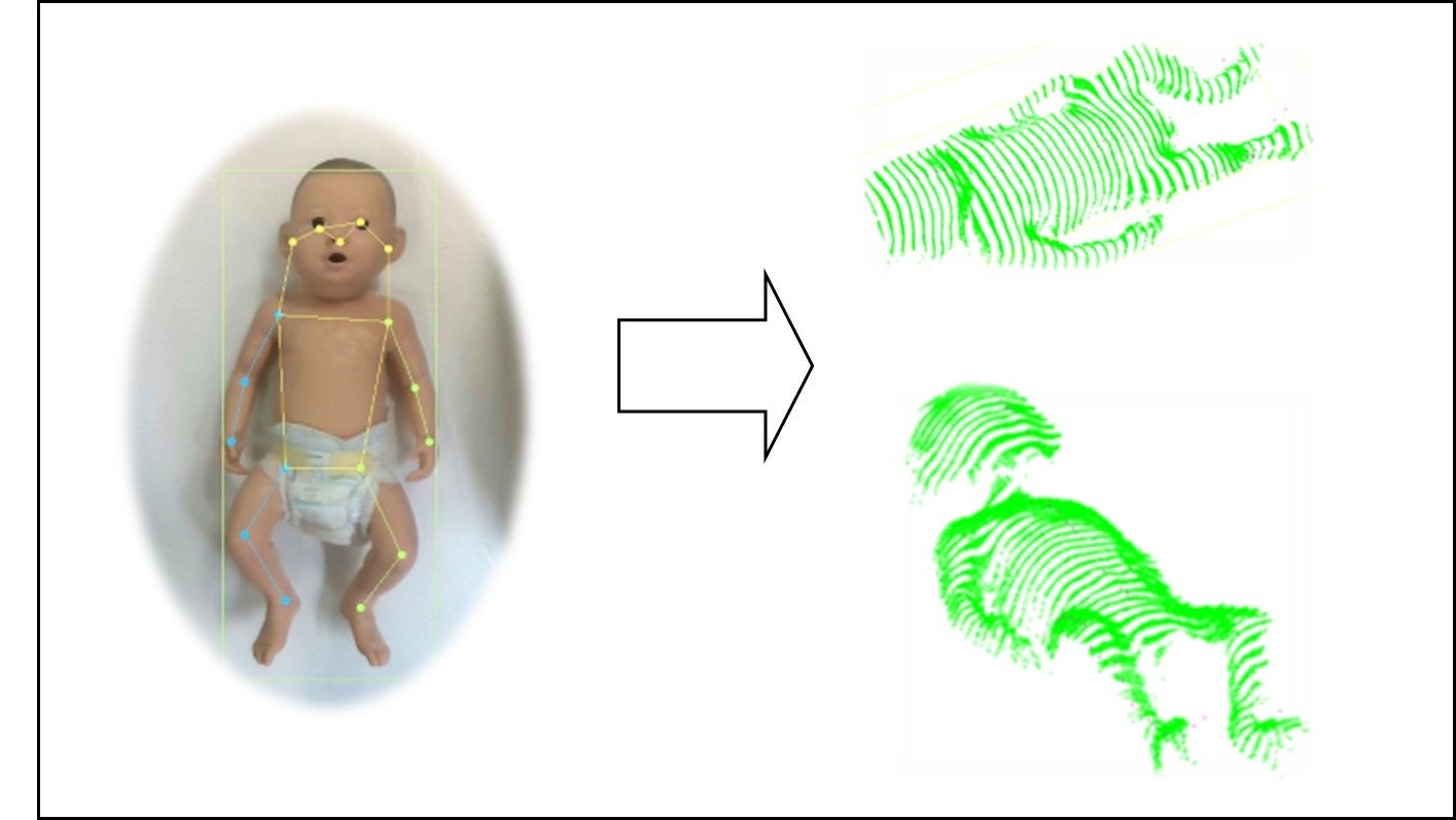 3Dカメラで撮影された画像から新生児を抽出、 各部位を認識させて3Dデータ化し、標準モデルとフィッティングさせる。