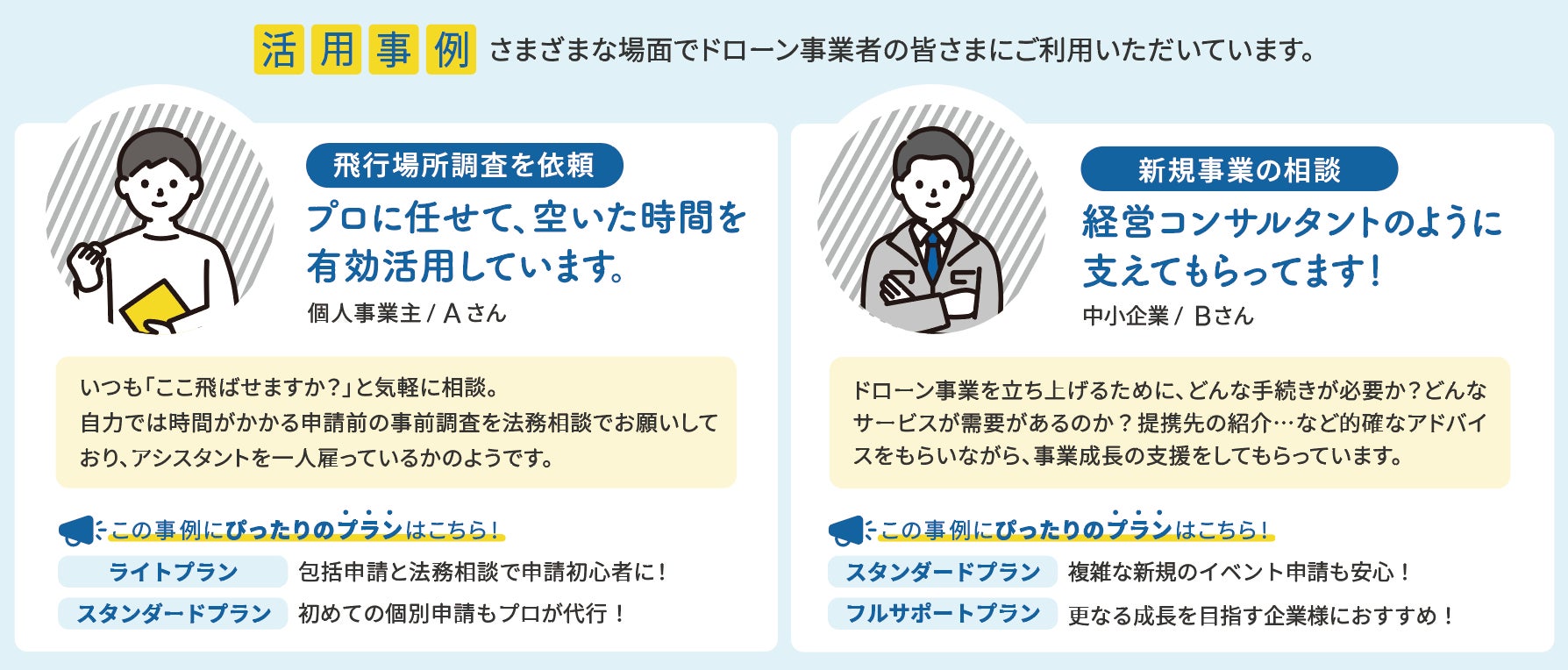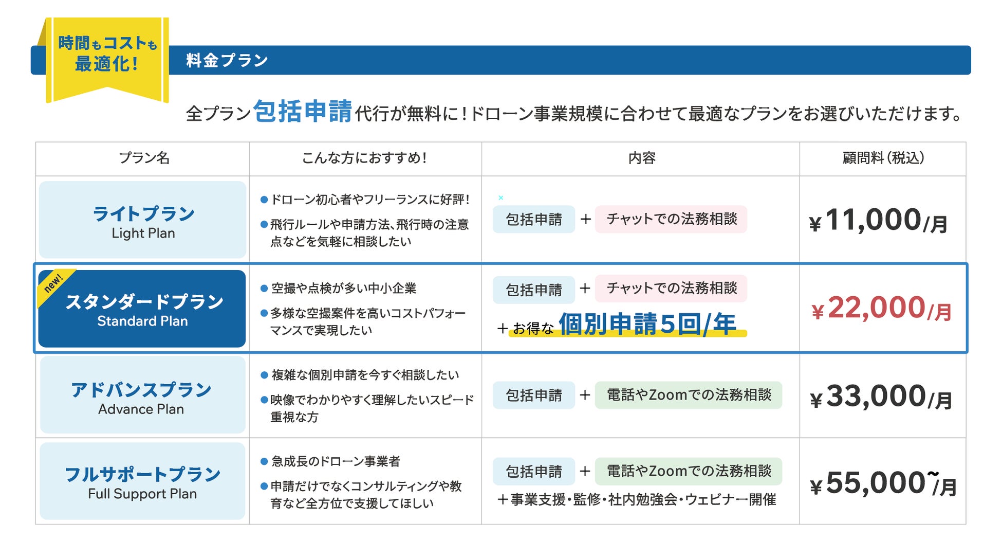 従来ご好評いただいていた法務相談サービスをリニューアルし、飛行に欠かせない包括申請や個別申請も無料で代行。より充実した法務サポートで、ドローン事業者のビジネス成長を後押しいたします!