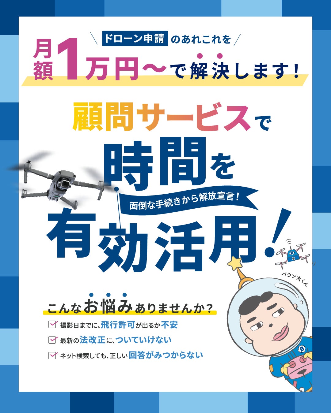 新しい顧問サービスでは、従来の法務相談に加えて、さまざまな飛行許可に必要な包括申請や個別申請の代行を無料で提供し、サポート内容を拡充いたしました。