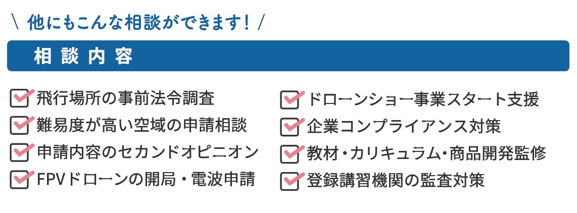 ご自身でドローン飛行許可申請の手続きを行う際に、ドローンを飛ばしたい場所や飛行方法などのルールや確認するべき内容などを相談するだけでなく、ドローン事業活動のアドバイス、商品サービスの開発監修、国家資格や民間資格のスクール運営に関する相談など幅広く対応しています。