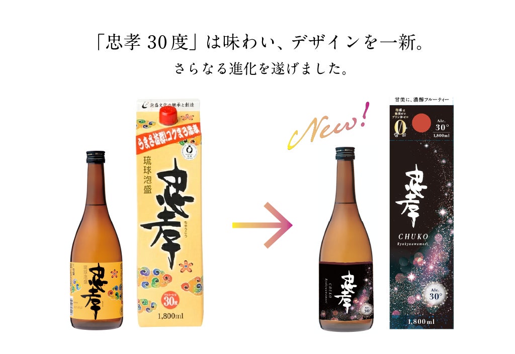 【忠孝酒造】「忠孝 30度」泡盛が進化してフルリニューアル!濃醇フルーティーでコク深い贅沢な味わいへ。