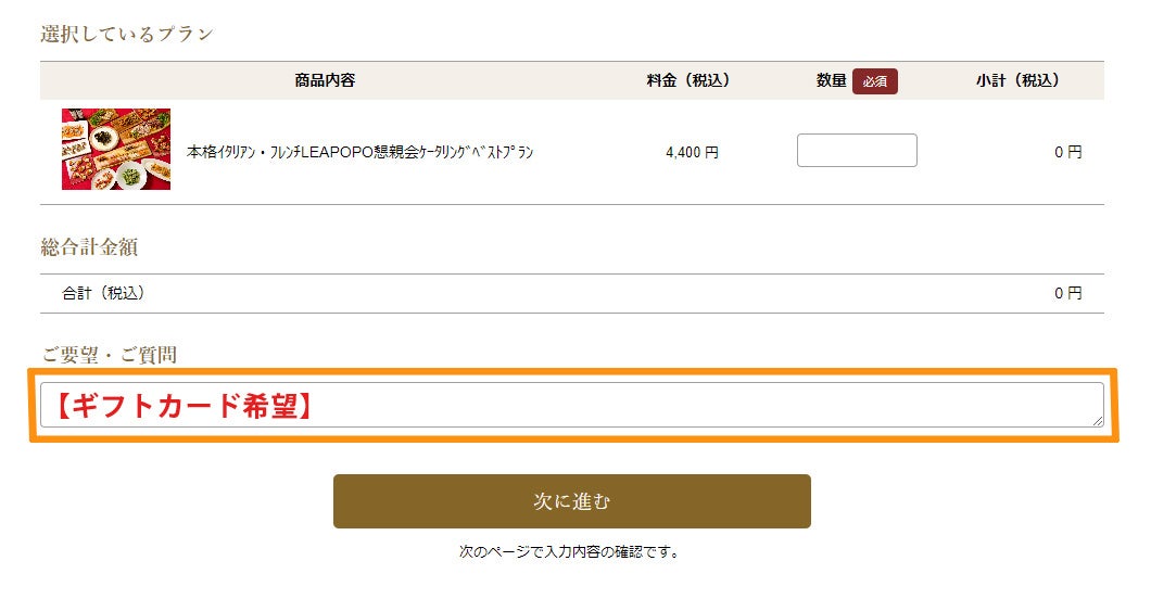 ※HPからの場合:お料理ご注文時の「ご要望・ご質問欄」に【ギフトカード希望】とご記載ください。