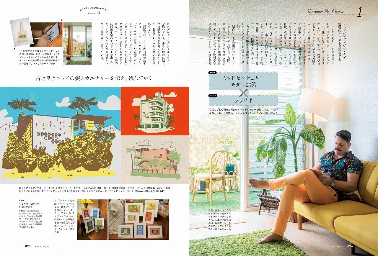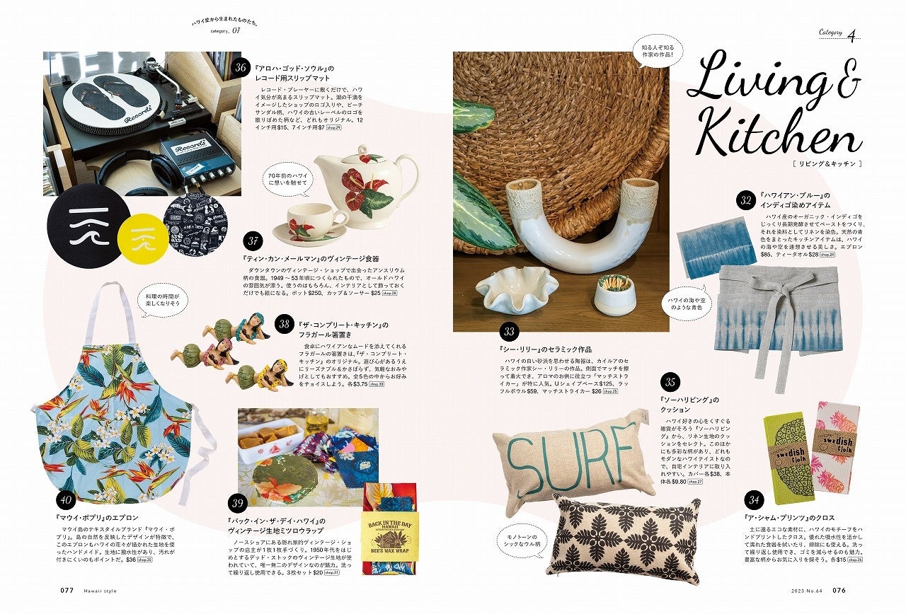 現地クリエイターのインタビューや、ハワイモチーフをあしらった最新デザイン、ハワイのカルチャーが根付くものなど、さまざまな視点から‟ハワイ愛からうまれたものたち”を紹介している大特集です。