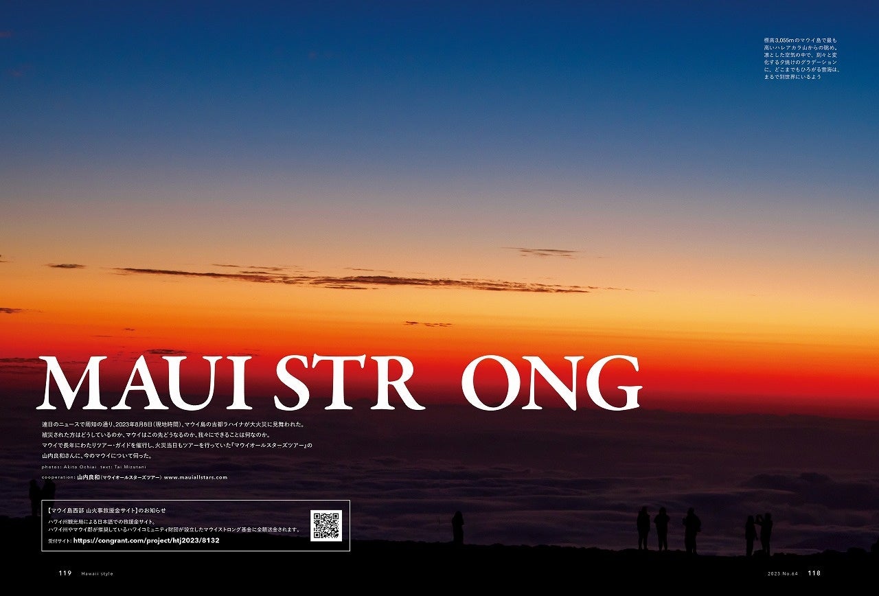 ラハイナが火災に見舞われたマウイのグラフィックページを掲載。現地でツアーガイドを催行している山内良和(やまうち・よしかず)さんにインタビューを行い、マウイが求めていることはなにか、現地の声を取り上げています。