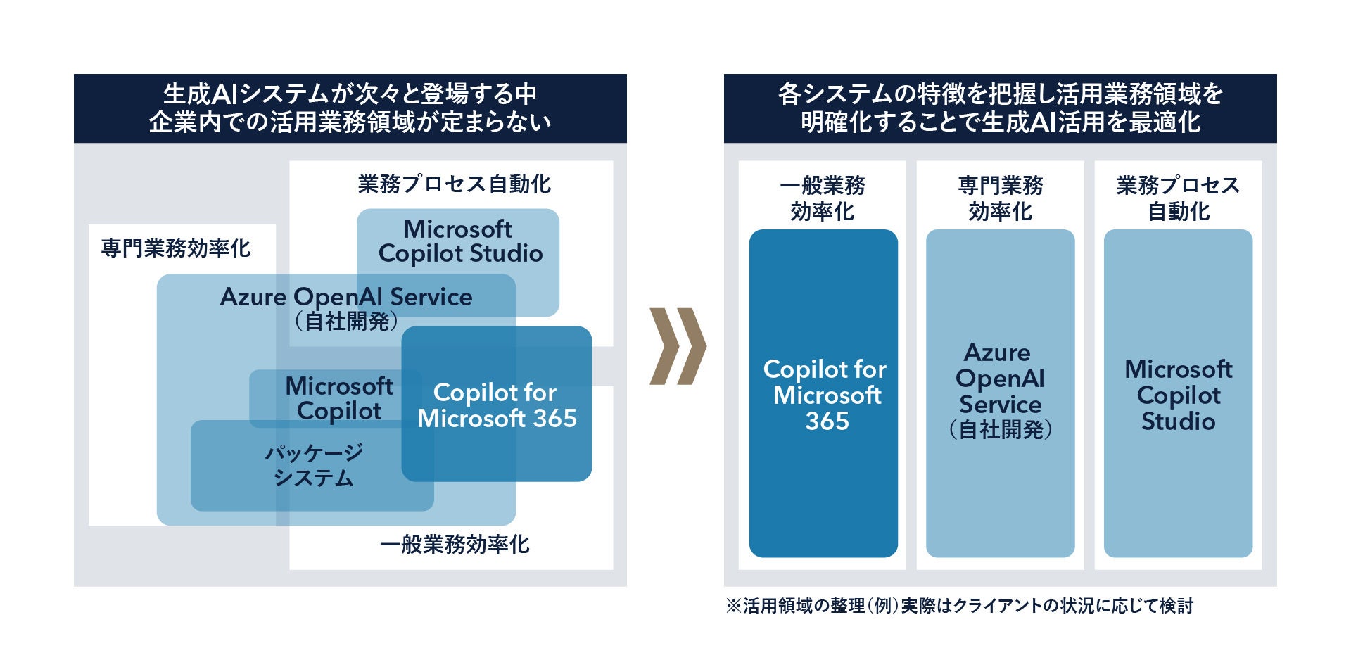 本サービスでは、Copilot for Microsoft 365 の効果的な利用と費用対効果の最大化に向けて、企業がすでに利用している他の生成AIシステムと Copilot for Microsoft 365 の機能重複を整理し、実業務に合わせた活用ができるように支援します。また、機能重複を整理する際は、例えば既存の生成AIシステムの特徴を踏まえ、その活用領域を拡張させるなど、全体最適の視点を持って企業における生成AIシステム活用の高度化につなげます。
