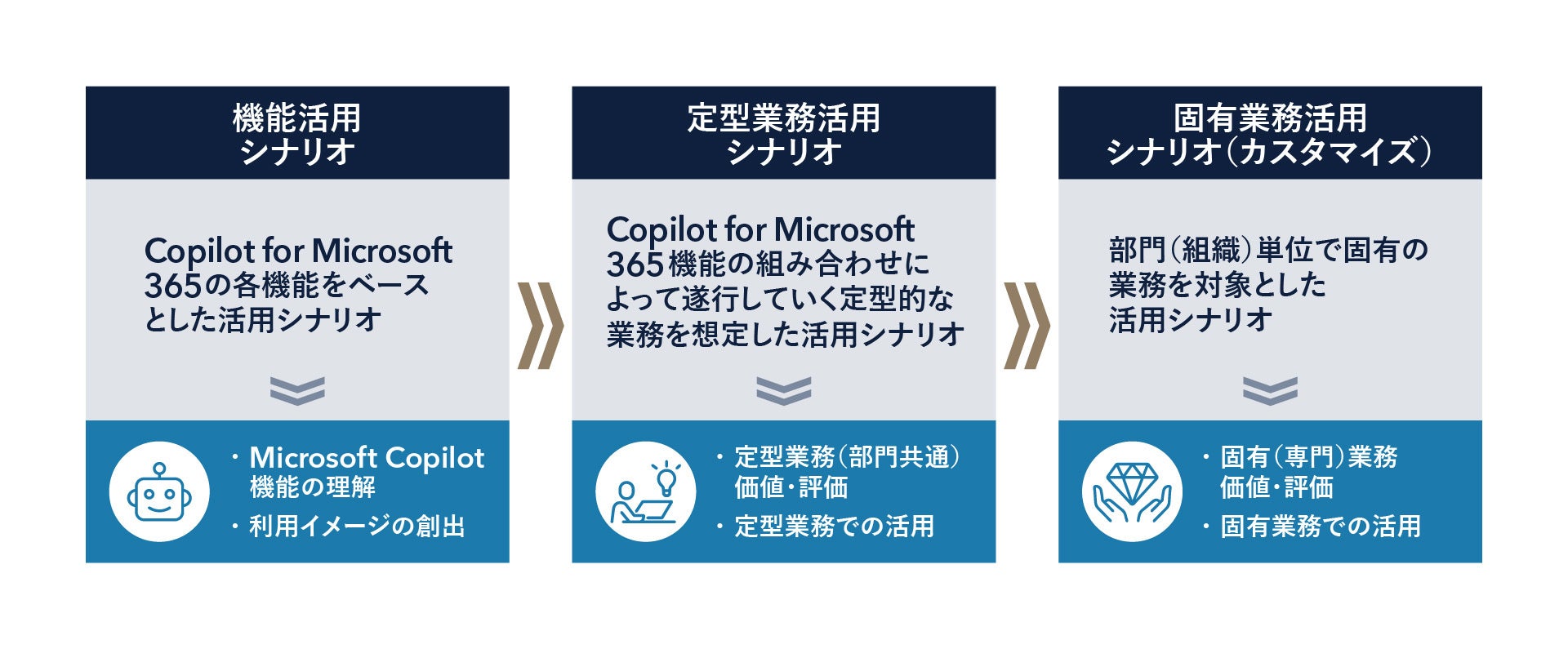 企業における生成AIの活用が進む中、Microsoft 365 アプリケーションと連携する Copilot for Microsoft 365 が企業向けに提供され、業務利用の加速が見込まれます。一方で Copilot for Microsoft 365 を単にツールとして導入するだけでは、個々人の作業効率向上にとどまり、効果的な利用や生産性向上につながらず、投資効率の低下を招く可能性があります。