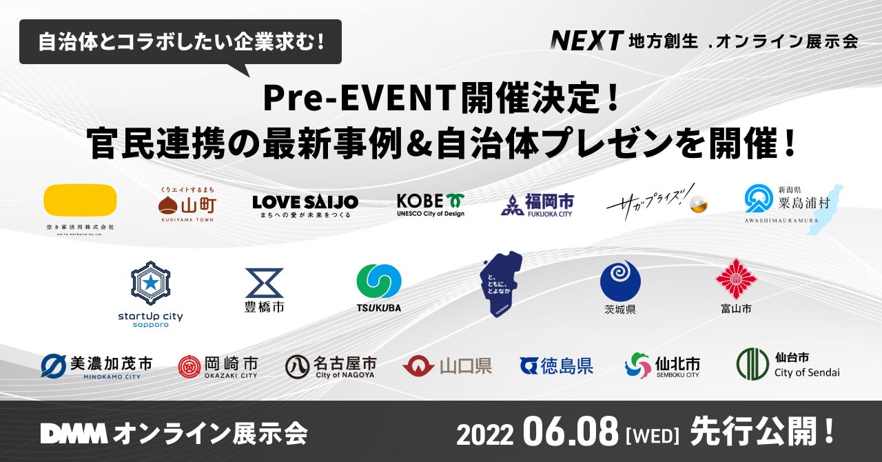 合同会社DMM.com(東京都港区、会長 兼 CEO 亀山敬司 以下、「DMM」)が展開するDMMオンライン展示会では、2022年6月15日(水)〜6月17日(金)に開催する「NEXT地方創生.オンライン展示会」において、官民連携の最新事例が知れる20セッション以上のケーススタディ発表と全国自治体による逆オファープレゼンの実施が決定いたしましたのでお知らせいたします。また、2022年6月8日(水)〜6月10日(金)の期間で、一部コンテンツを先行して視聴できるPre-EVENTを開催いたします。