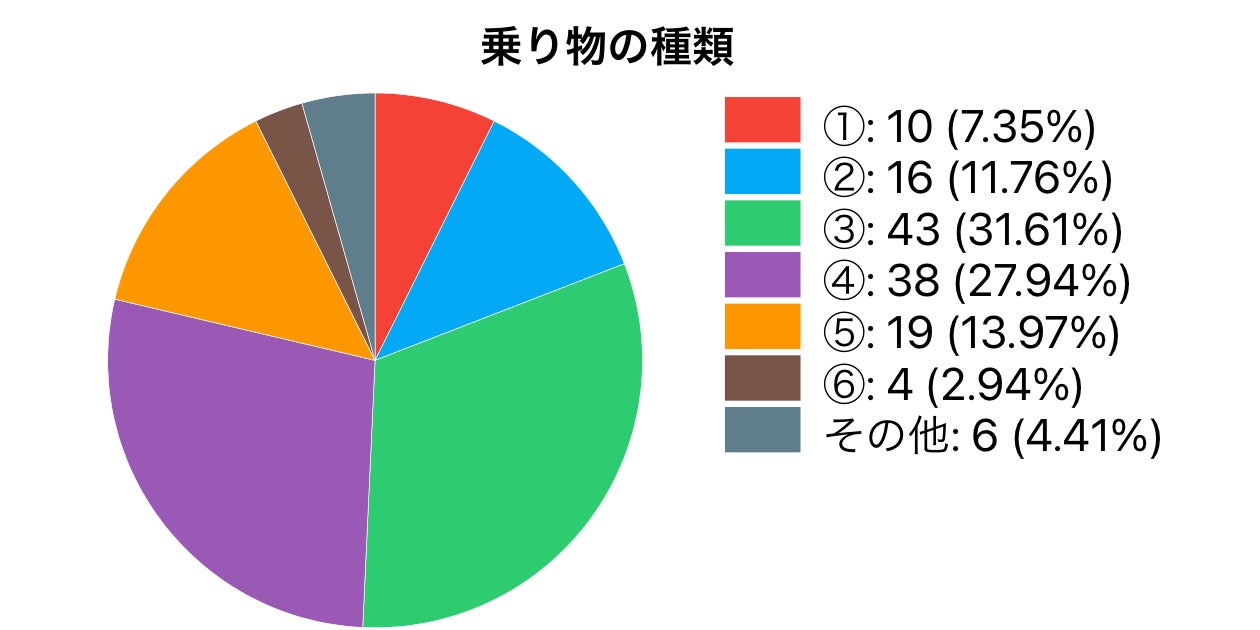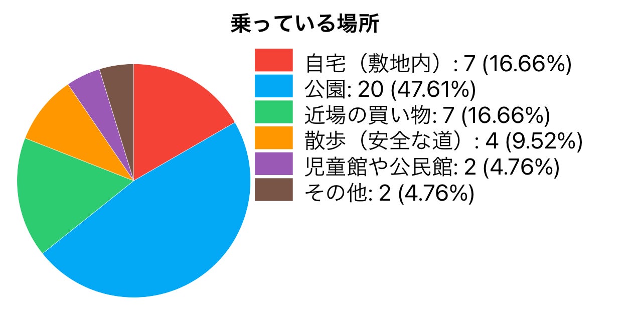 多くの子どもが週に1回以上は乗り物に乗っていました。公園での遊びの一つとして乗り物を楽しむ人が多い他、近場への買い物や散歩での移動手段としても乗り物が利用されています。いずれの場合もママ・パパが安全な場所を選び、目が届くところで乗せているようです。