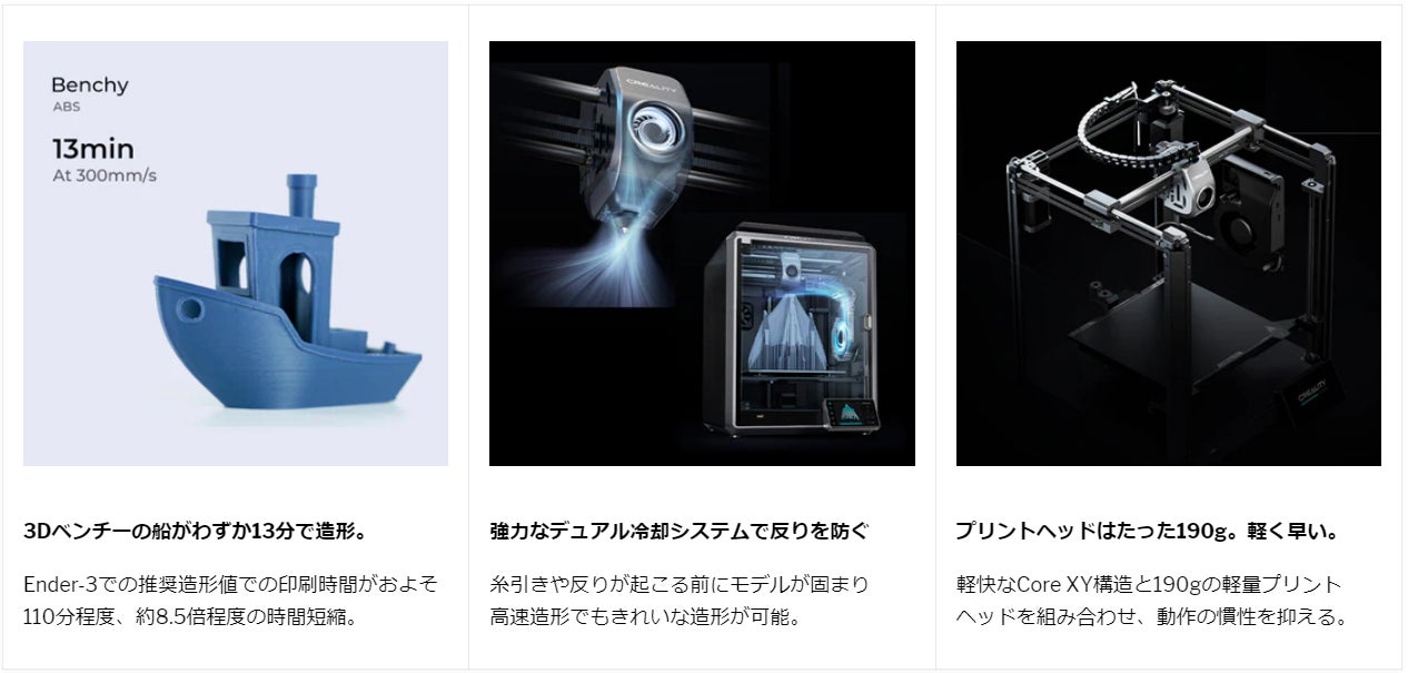 造形速度は600mm/s。 一般的な造形速度50mm/sのプリンターと比較して約12倍の速度で、 3Dベンチマークの船が最短13分で作成できます。