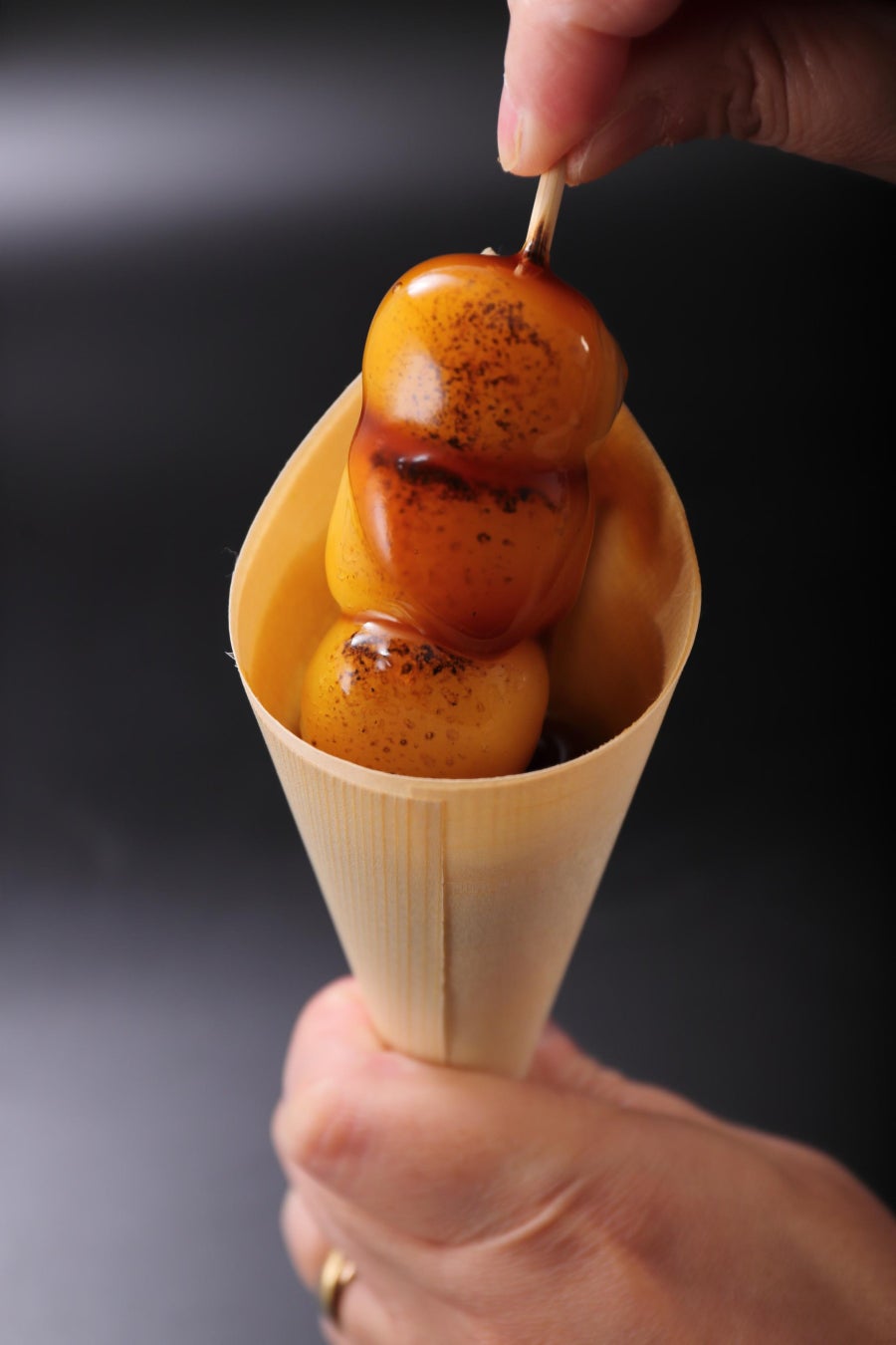 伏見稲荷店では、ここでしか味わえない店舗限定のフラワー団子や、みたらし団子、とろける食感が人気のわらび餅など、参拝や観光の合間に気軽に楽しめる食べ歩き商品を豊富に取り揃えています。
