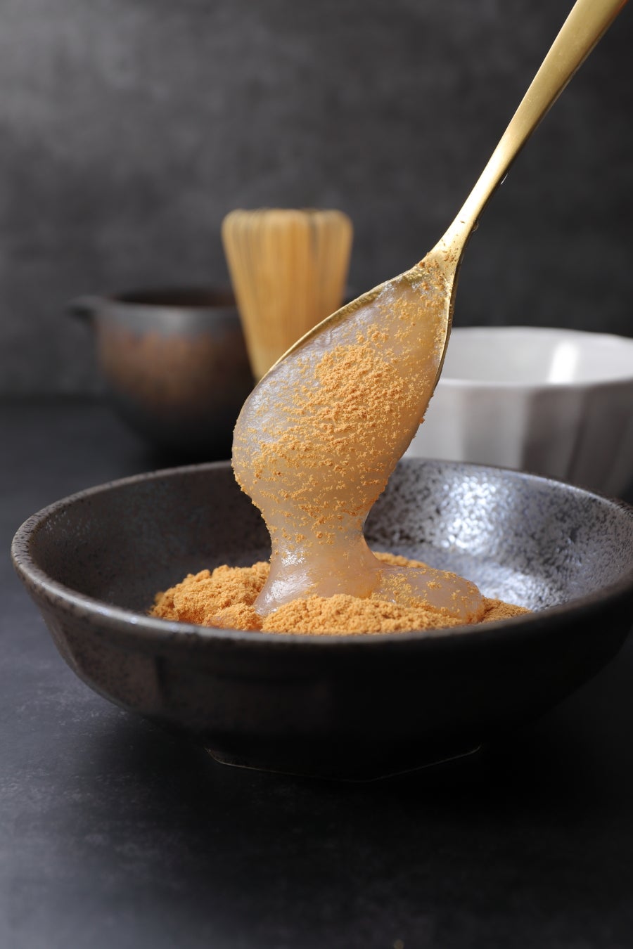 とろける生チョコのようなお味のわらびもち。ぷるんとした食感のわらび餅に、香り高いココアを纏わせた“とろけるショコラ和スイーツ”。深く濃厚なカカオのコクとやさしい甘さが口いっぱいに広がります。